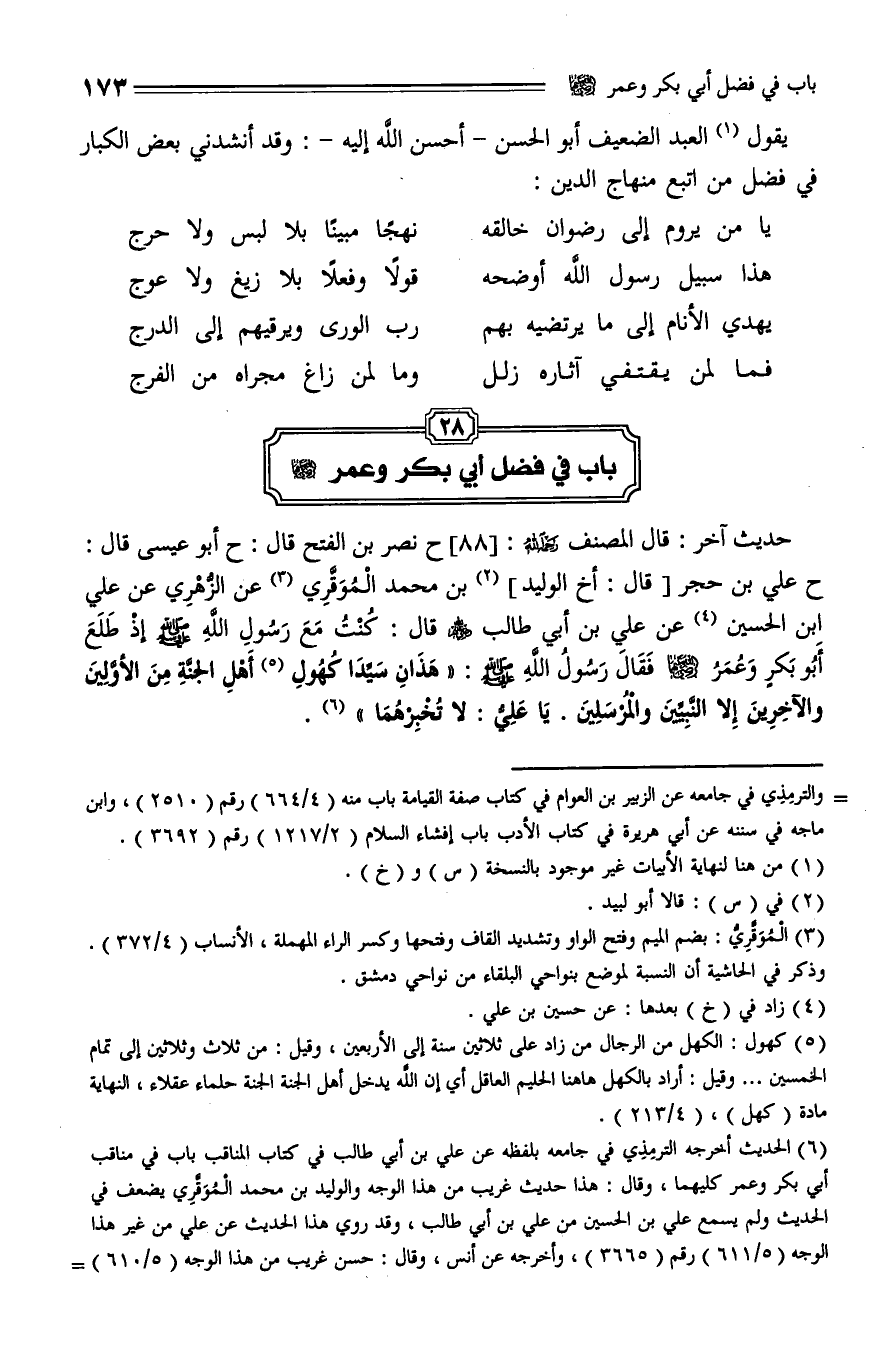 88 - قال: حَدَّثَنَا نَصْرُ بْنُ الْفَتْحِ , قال: حَدَّثَنا أَبُو عِيسَى، قال: حَدَّثَنا عَلِيُّ بْنُ حُجْرٍ، قال: أخبرنا الوليد بْنُ مُحَمَّدٍ الْمُوَقَّرِيُّ , عَنِ الزُّهْرِيِّ , عَنْ عَلِيِّ بْنِ الْحُسَيْنِ , عَنْ عَلِيِّ بْنِ أَبِي طَالِبٍ , رَضِيَ اللَّهُ عَنْهُ، قال: كُنْتُ مَعَ رَسُولِ اللَّهِ - صلى الله عليه وسلم - إِذْ طَلَعَ أَبُو بَكْرٍ وَعُمَرُ , فَقَالَ رَسُولُ اللَّهِ - صلى الله عليه وسلم -: " هَذَانِ سَيِّدَا كُهُولِ أَهْلِ الْجَنَّةِ مِنَ الْأَوَّلِينَ وَالْآخِرِينَ إِلَّا النَّبِيِّينَ وَالْمُرْسَلِينَ , يَا عَلِيُّ لَا تُخْبِرْهُمَا ".
