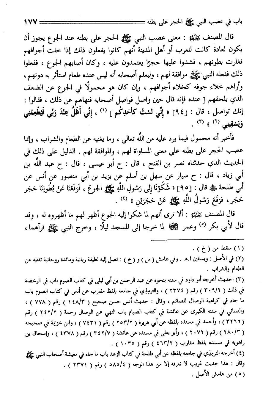 95 - حَدَّثَنَا نَصْرُ بْنُ الْفَتْحِ، قال: حَدَّثَنا أَبُو عِيسَى، قال: حَدَّثَنا عَبْدُ اللَّهِ بْنُ أَبِي زِيَادٍ، قال: حَدَّثَنا سَيَّارٌ , عَنْ سَهْلِ بْنِ أَسْلَمَ , عَنْ يَزِيدَ بْنِ أَبِي مَنْصُورٍ , عَنْ أَنَسِ , عَنْ أَبِي طَلْحَةَ , رَضِيَ اللَّهُ عَنْهُما، قال: " شَكَوْنَا إِلَى رَسُولِ اللَّهِ - صلى الله عليه وسلم - الْجُوعَ , فَرَفَعْنَا عَنْ بُطُونِنَا حَجَر حَجَر , فَرَفَعَ رَسُولُ اللَّهِ - صلى الله عليه وسلم - عَنْ حَجَرَيْنِ ".