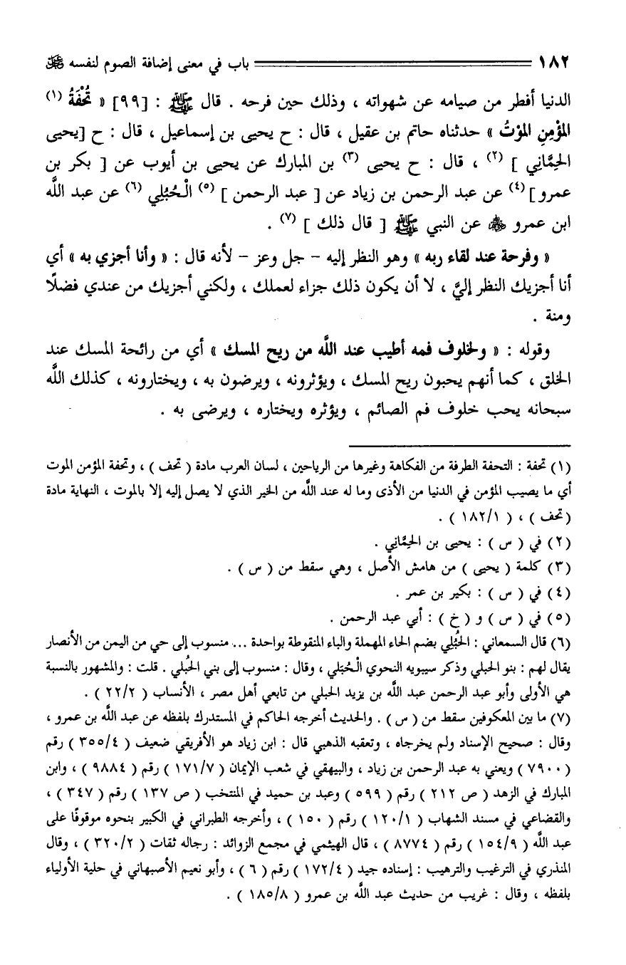 99 - حَدَّثَنَا حَاتِمُ بْنُ عَقِيلٍ، قال: حَدَّثَنا يَحْيَى بْنُ إِسْمَاعِيلَ، قال: حَدَّثَنا يَحْيَى الْحِمَّانِيِّ، قال: حَدَّثَنا ابْنُ المُبَارَك , عَنْ يَحْيَى بْنِ أَيُّوبَ , عَنْ بَكْرِ بْنِ عَمْرٍو , عَنْ عَبْدِ الرَّحْمَنِ بْنِ زِيَادٍ , عَنْ أَبِي عَبْدِ الرَّحْمَنِ الْحُبُلِيِّ , عَنْ عَبْدِ اللَّهِ بْنِ عَمْرٍو , عَنْ النبي عليه السلام: " تُحْفَةُ الْمُؤْمِنِ الْمَوْتُ ".