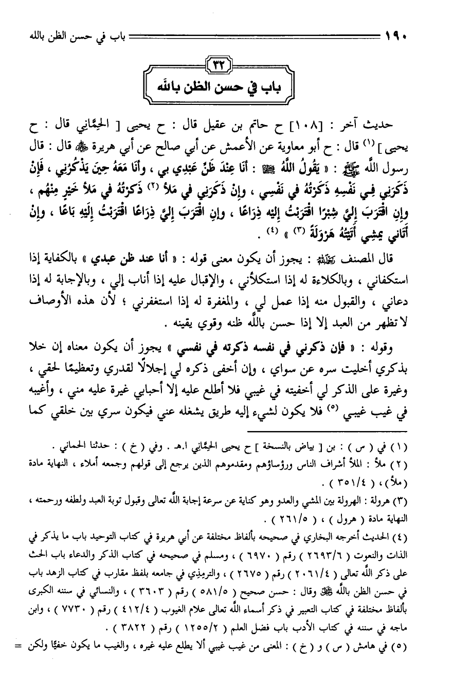 108 - قال: حَدَّثَنَا حَاتِمُ بْنُ عَقِيلٍ، قال: حَدَّثَنَا يَحْيَى بْنُ إسماعيل، قال: حَدَّثَنَا الْحِمَّانِيُّ، قال: حَدَّثَنَا أَبُو مُعَاوِيَةَ , عَنِ الْأَعْمَشِ , عَنْ أَبِي صَالِحٍ , عَنْ أَبِي هُرَيْرَةَ , قَالَ: قال رَسُولُ اللَّهِ - صلى الله عليه وسلم -: " يَقُولُ اللَّهُ تَعَالَى: أَنَا عِنْدَ ظَنِّ عَبْدِي بِي , وَأَنَا مَعَهُ حِينَ يَذْكُرُنِي , فَإِنْ ذَكَرَنِي فِي نَفْسِهِ ذَكَرْتُهُ فِي نَفْسِي , وَإِنْ ذَكَرَنِي فِي مَلَأٍ ذَكَرْتُهُ فِي مَلَأٍ خَيْرٍ مِنْهُمْ , وَإِنِ اقْتَرَبَ إِلَيَّ شِبْرًا اقْتَرَبْتُ إِلَيْهِ ذِرَاعًا , وَإِنِ اقْتَرَبَ إِلَيَّ ذِرَاعًا اقْتَرَبْتُ إِلَيْهِ بَاعًا , وَإِنْ أَتَانِي يَمْشِي أَتَيْتُهُ هَرْوَلَةً ".