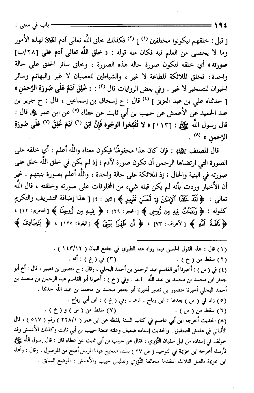 113 - أَخْبَرَنَا أَبُو الْقَاسِمِ عَبْدُ الرَّحْمَنِ بن محمد بْنُ أَحْمَدَ الْبَجَلِيُّ , قال: أخبرنا مَنْصُورُ بْنُ نَصْرٍ، قال: أخبرنا أَبُو جَعْفَرِ مُحَمَّدِ بْنِ مُحَمَّدٍ بْنُ عَبْدُ اللَّهِ، قال: حدثنا علي بن عبد العزيز، قال: حَدَّثَنا إِسْحَاقُ بْنُ إِسْمَاعِيلَ، قال: حدثنا جَرِيرُ بْنُ عَبْدِ الْحَمِيدِ , عَنِ الْأَعْمَشِ , عَنْ حَبِيبِ بْنِ أَبِي ثَابِتٍ , عَنْ عَطَاءِ بْنِ أَبِي رَبَاحٍ , عَنِ ابْنِ عُمَرَ , رَضِيَ اللَّهُ عَنْهُمَا، قَالَ: قال رَسُولُ اللَّهِ صلى الله عليه وسلم: " لَا تُقَبِّحُوا الْوُجُوهَ , فَإِنَّ ابن آدَمَ خُلِقَ عَلَى صُورَةِ الرَّحْمَنِ ".