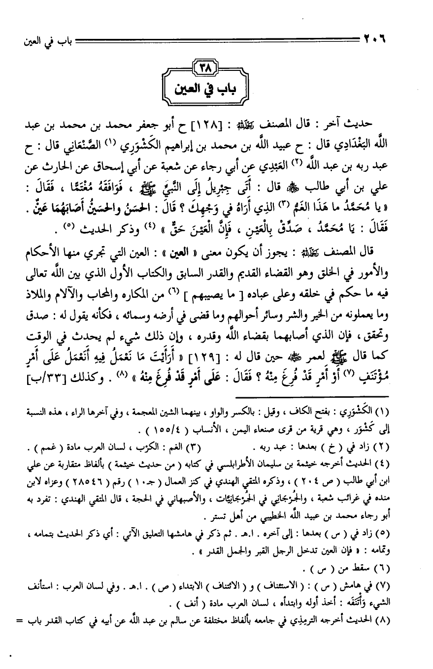 128 - حَدَّثَنا أبو جعفر مُحَمَّدُ بْنُ مُحَمَّدِ بن عبد الله الْبَغْدَادِيُّ، قال: حَدَّثَنا عُبَيْدُ اللَّهِ بْنُ مُحَمَّدِ بْنِ إِبْرَاهِيمَ الْكَشْوَرِيُّ الصَّنْعَانِيُّ، قال: حَدَّثَنا عَبْدُ رَبِّهِ بْنُ عَبْدِ اللَّهِ بْنِ عَبْدِ رَبِّهِ الْعَبْدِيُّ , عَنْ أَبِي رَجَاءٍ , عَنْ شُعْبَةَ , عَنْ أَبِي إِسْحَاقَ , عَنِ الْحَارِثِ , عَنْ عَلِيٍّ بن أبي طالب - رَضِيَ اللَّهُ عَنْهُ - قال: " أَتَى جِبْرِيلُ إلى النَّبِيَّ - صلى الله عليه وسلم - فَوَافَقَهُ مُغْتَمًّا , فَقال: يَا مُحَمَّدُ مَا هَذَا الْغَمُّ الَّذِي أَرَاهُ فِي وَجْهِكَ؟ قَالَ: الْحَسَنُ وَالْحُسَيْنُ أَصَابَهُمَا عَيْنٌ , فَقال: يَا مُحَمَّدُ صَدِّقْ بِالْعَيْنِ , فَإِنَّ الْعَيْنَ حَقٌّ ... ". وَذَكَرَ الْحَدِيثَ إِلَى آخِرِهِ.