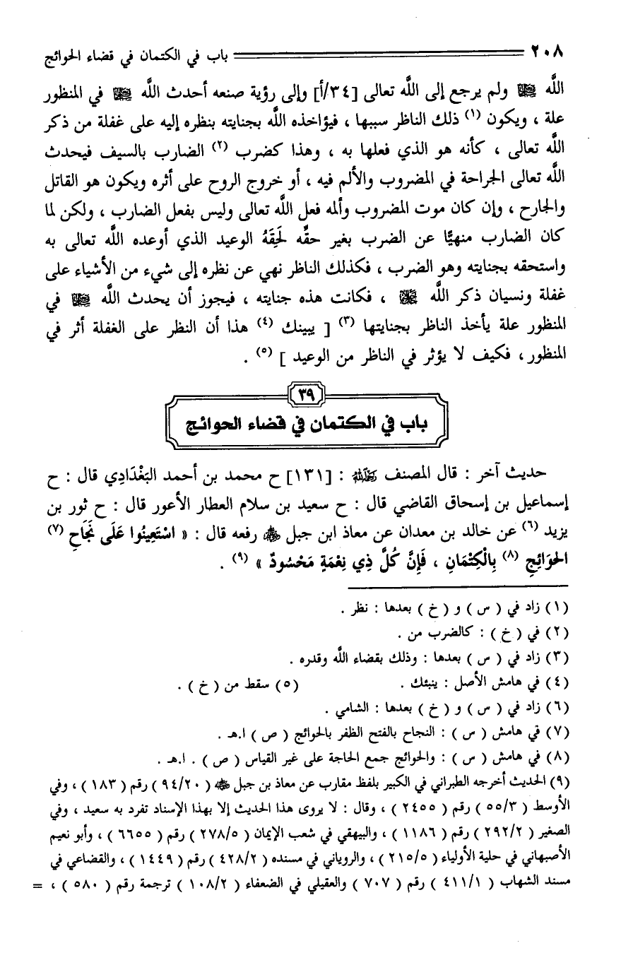 131 - حَدَّثَنَا مُحَمَّدُ بْنُ أَحْمَدَ الْبَغْدَادِيُّ , قال: حَدَّثَنا إِسْمَاعِيلُ بْنُ إِسْحَاقَ الْقَاضِي، قال: حَدَّثَنا سَعِيدُ بْنُ سَلَّامٍ الْعَطَّارُ الْأَعْوَرُ، قال: حَدَّثَنا ثَوْرُ بْنُ يَزِيدَ الشَّامِيُّ , عَنْ خَالِدِ بْنِ مَعْدَانَ , عَنْ مُعَاذِ بْنِ جَبَلٍ , رَضِيَ اللَّهُ عَنْهُ رَفَعَهُ، قال: " اسْتَعِينُوا عَلَى نَجَاحِ الْحَوَائِجِ بِالْكِتْمَانِ , فَإِنَّ كُلَّ ذِي نِعْمَةٍ مَحْسُودٌ ".