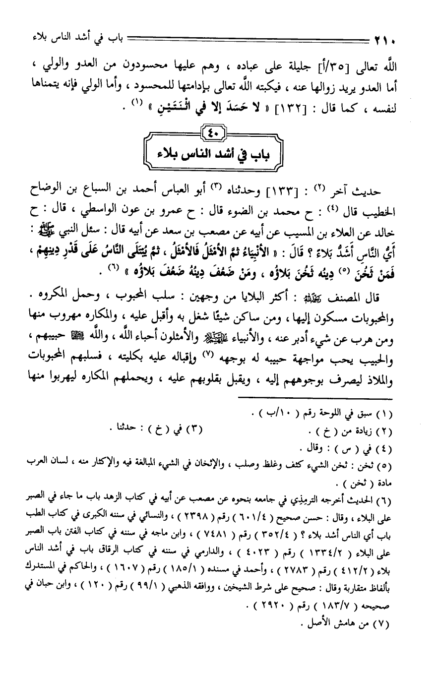 133 - حَدَّثَنَا أَبُو الْعَبَّاسِ أَحْمَدُ بْنُ سِبَاعِ بْنِ الْوَضَّاحِ الْخَطِيبُ، قال: حَدَّثَنا مُحَمَّدُ بْنُ الضوء، قال: حَدَّثَنا عَمْرُو بْنُ عَوْنٍ الْوَاسِطِيُّ، قال: حَدَّثَنا خَالِدُ، عن الْعَلَاءِ بْنِ الْمُسَيَّبِ , عَنْ أَبِيهِ , عَنْ مُصْعَبِ بْنِ سَعْدٍ , عَنْ أَبِيهِ , قال: سُئِلَ النَّبِيُّ - صلى الله عليه وسلم -: أَيُّ النَّاسِ أَشَدُّ بَلَاءً؟ قال: " الْأَنْبِيَاءُ , ثُمَّ الْأَمْثَلُ فَالْأَمْثَلُ , ثُمَّ يُبْتَلَى النَّاسُ عَلَى قَدْرِ دِينِهِمْ , فَمَنْ ثَخُنَ دِينُهُ ثَخُنَ بَلَاؤُهُ , وَمَنْ ضَعُفَ دِينُهُ ضَعُفَ بَلَاؤُهُ ".