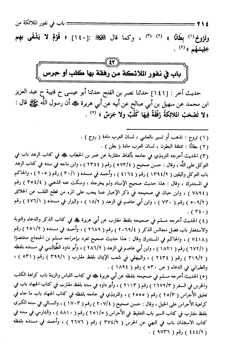141 - حَدَّثَنَا نصرُ بْنُ الْفَتْحِ , قال: حَدَّثَنا أَبُو عِيسَى، قال: حَدَّثَنا قُتَيْبَةَ، قال: حَدَّثَنا عَبْدُ الْعَزِيزِ بْنُ مُحَمَّدٍ , عَنْ سُهَيْلِ بْنِ أَبِي صَالِحٍ , عَنْ أَبِيهِ , عَنْ أَبِي هُرَيْرَةَ - رضي الله عنه - أَنَّ رَسُولَ اللَّهِ - صلى الله عليه وسلم - قال: " لَا تَصْحَبُ الْمَلَائِكَةُ رُفْقَةً فِيهَا كَلْبٌ وَلَا جَرَسٌ ".