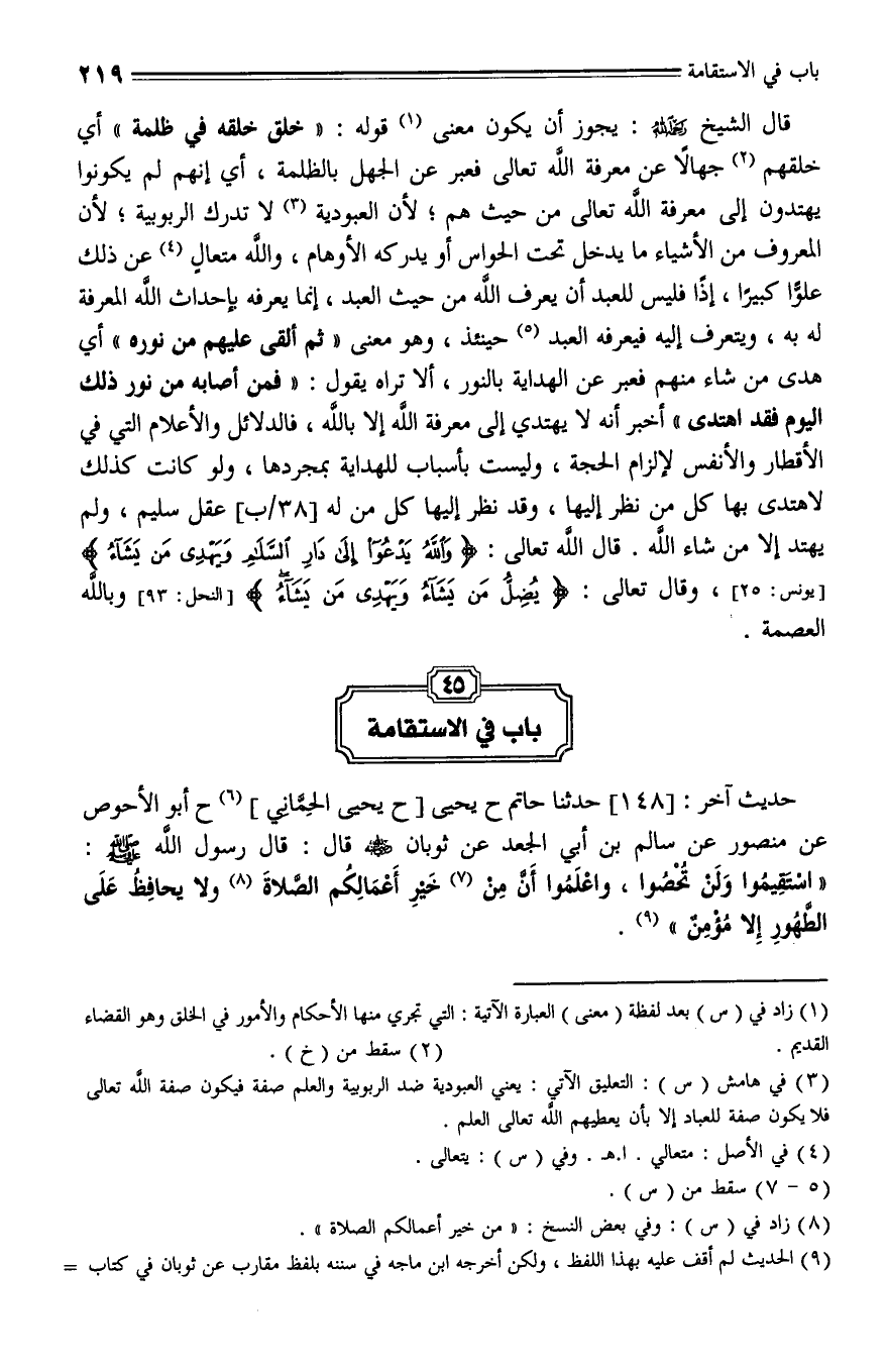 148 - حَدَّثَنا حَاتِمُ، حَدَّثَنا يَحْيَى، حَدَّثَنا يَحْيَى الحماني، حَدَّثَنا أَبُو الْأَحْوَصِ , عَنْ مَنْصُورٍ , عَنْ سَالِمِ بْنِ أَبِي الْجَعْدِ , عَنْ ثَوْبَانَ - رضي الله عنه - قَالَ رَسُولُ اللَّهِ صلى الله عليه وسلم: " اسْتَقِيمُوا وَلَنْ تُحْصُوا , وَاعْلَمُوا أَنَّ من خَيْرِ أَعْمَالِكُمُ الصَّلَاةَ , وَلا يُحَافِظُ عَلَى الطُّهُورِ إِلَّا مُؤْمِنٌ ".