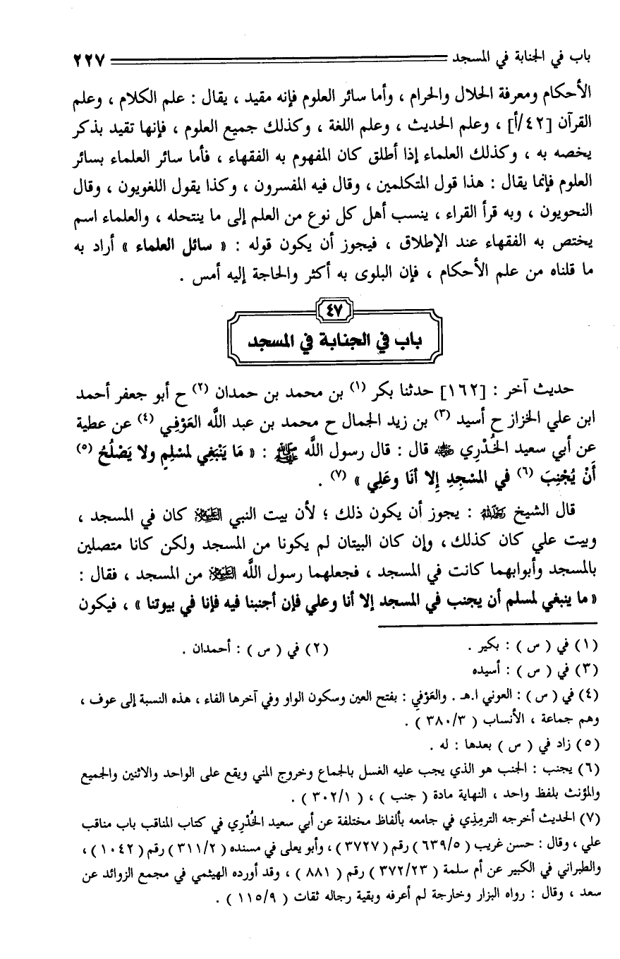 162 - حَدَّثَنَا بكَر بْنُ مُحَمَّدِ بْنِ حَمْدَانَ , حَدَّثَنا أَبُو جَعْفَرٍ أَحْمَدُ بْنُ عَلِيٍّ الْخَزَّازُ، حَدَّثَنا أَسِيدَ بْنُ زَيْدٍ الْجَمَّالُ، حَدَّثَنا مُحَمَّدُ بْنُ عَبْدِ اللَّهِ الْعَوْفِيُّ , عَنْ عَطِيَّةَ , عَنْ أَبِي سَعِيدٍ الْخُدْرِيِّ , قَالَ: قال رَسُولُ اللَّهِ صلى الله عليه وسلم: " مَا يَنْبَغِي لِمُسْلِمٍ وَلَا يَصلح لَهُ أَنْ يُجْنِبَ فِي الْمَسْجِدِ إِلَّا أَنَا وَعَلِيٌّ ".
