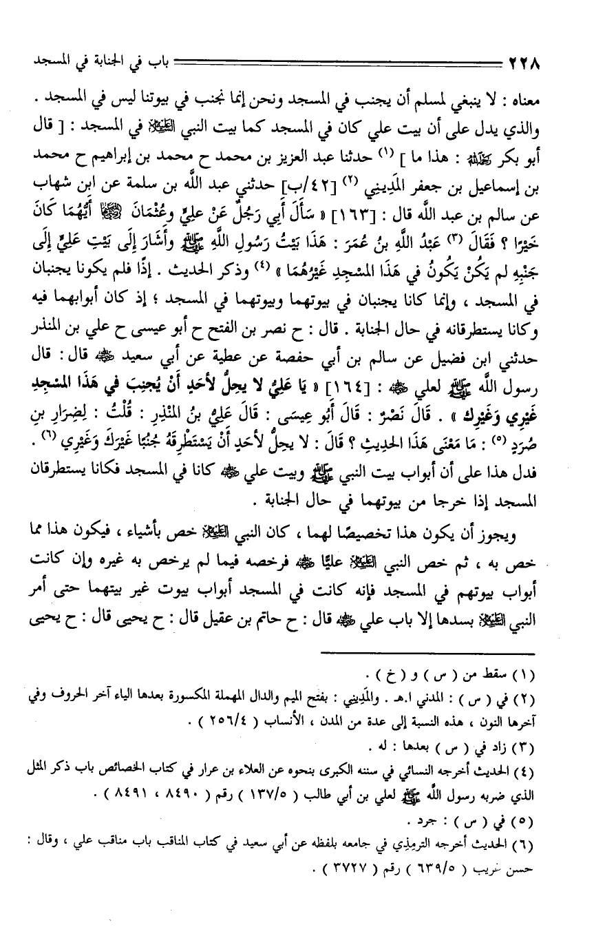 164 - قال: حَدَّثَنَا نَصْرُ بْنُ الْفَتْحِ، حدثنا أَبُو عِيسَى، حَدَّثَنا عَلِيُّ بْنُ الْمُنْذِرِ، حَدَّثَني ابن فُضَيْلٍ , عَنْ سَالِمِ بْنِ أَبِي حَفْصَةَ , عَنْ عَطِيَّةَ , عَنْ أَبِي سَعِيدٍ - رضي الله عنه - قال: قَالَ رَسُولُ اللَّهِ - صلى الله عليه وسلم - لِعَلِيٍّ - رضي الله عنه -: " يَا عَلِيُّ لَا يَحِلُّ لِأَحَدٍ أَنْ يُجْنِبَ فِي هَذَا الْمَسْجِدِ غَيْرِي وَغَيْرُكَ ". قَالَ نَصْرٌ: قَالَ أَبُو عِيسَى: قَالَ عَلِيُّ بْنُ الْمُنْذِرِ: قُلْتُ لِضِرَارِ بْنِ صُرَدَ: مَا مَعْنَى هَذَا الْحَدِيثِ؟ قال: لَا يَحِلُّ لِأَحَدٍ أَنْ يَسْتَطْرِقَهُ جُنُبًا غَيْرُك وَغَيْرِي.