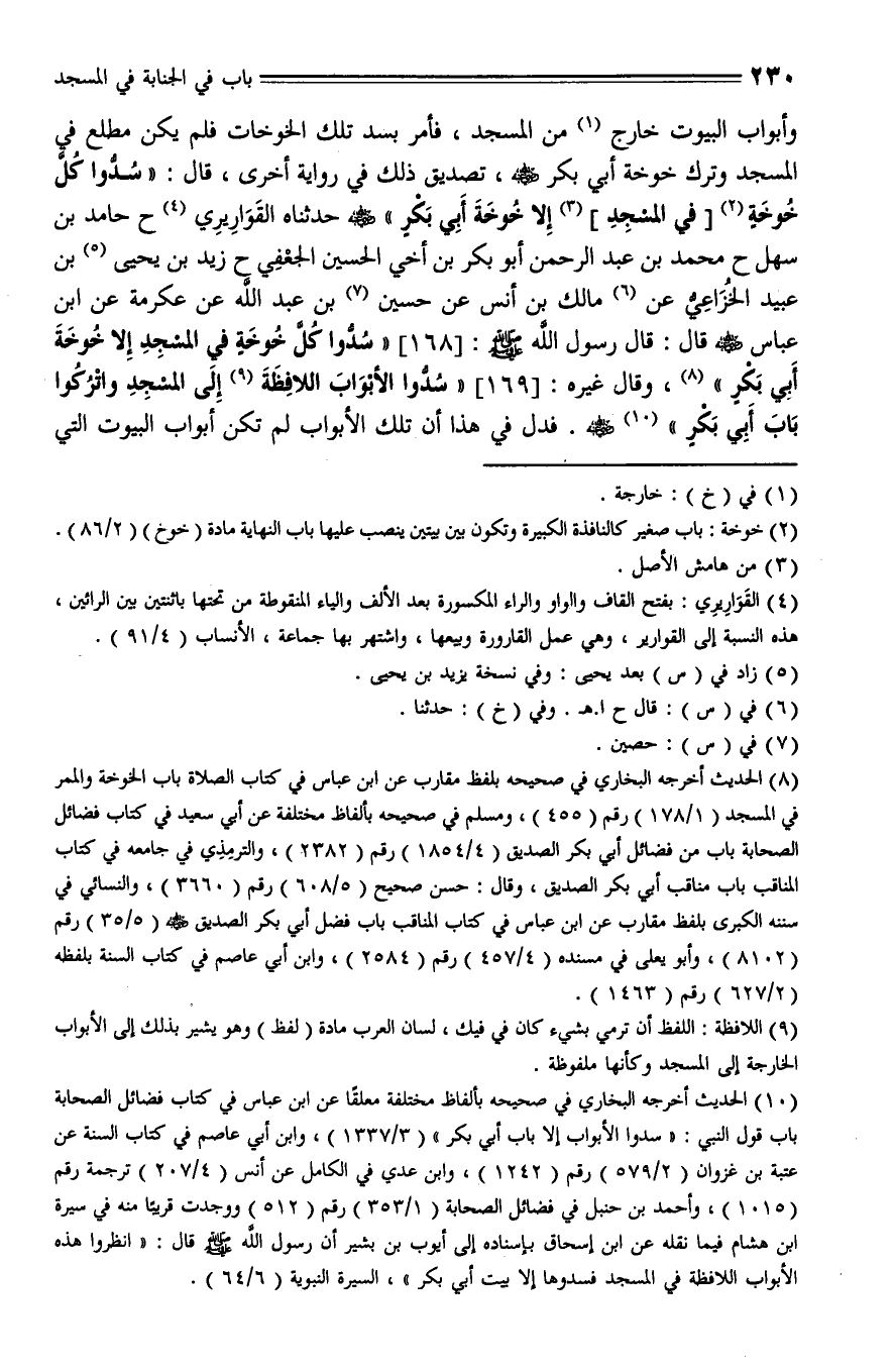 168 - حَدَّثَنَا الْقَوَارِيرِيُّ , حَدَّثَنا حَامِدُ بْنُ سَهْلٍ، حَدَّثَنا مُحَمَّدُ بْنُ عَبْدِ الرَّحْمَنِ بن أَبي بَكْرٍ بْنُ أَبِي الْحُسَيْنِ الْجُعْفِيُّ، حَدَّثَنا زَيْدُ بْنُ يَحْيَى بْنِ عُبَيْدٍ الْخُزَاعِيُّ، عن مَالِكُ بْنُ أَنَسٍ , عَنْ حُسَيْنِ بْنِ عَبْدِ اللَّهِ , عَنْ عِكْرِمَةَ , عَنِ ابْنِ عَبَّاسٍ - رَضِيَ اللَّهُ عَنْهُ - (ق45ب)، قَالَ: قال رَسُولُ اللَّهِ صلى الله عليه وسلم: " سُدُّوا كُلَّ خَوْخَةٍ فِي الْمَسْجِدِ إِلَّا خَوْخَةَ أَبِي بَكْرٍ ".
