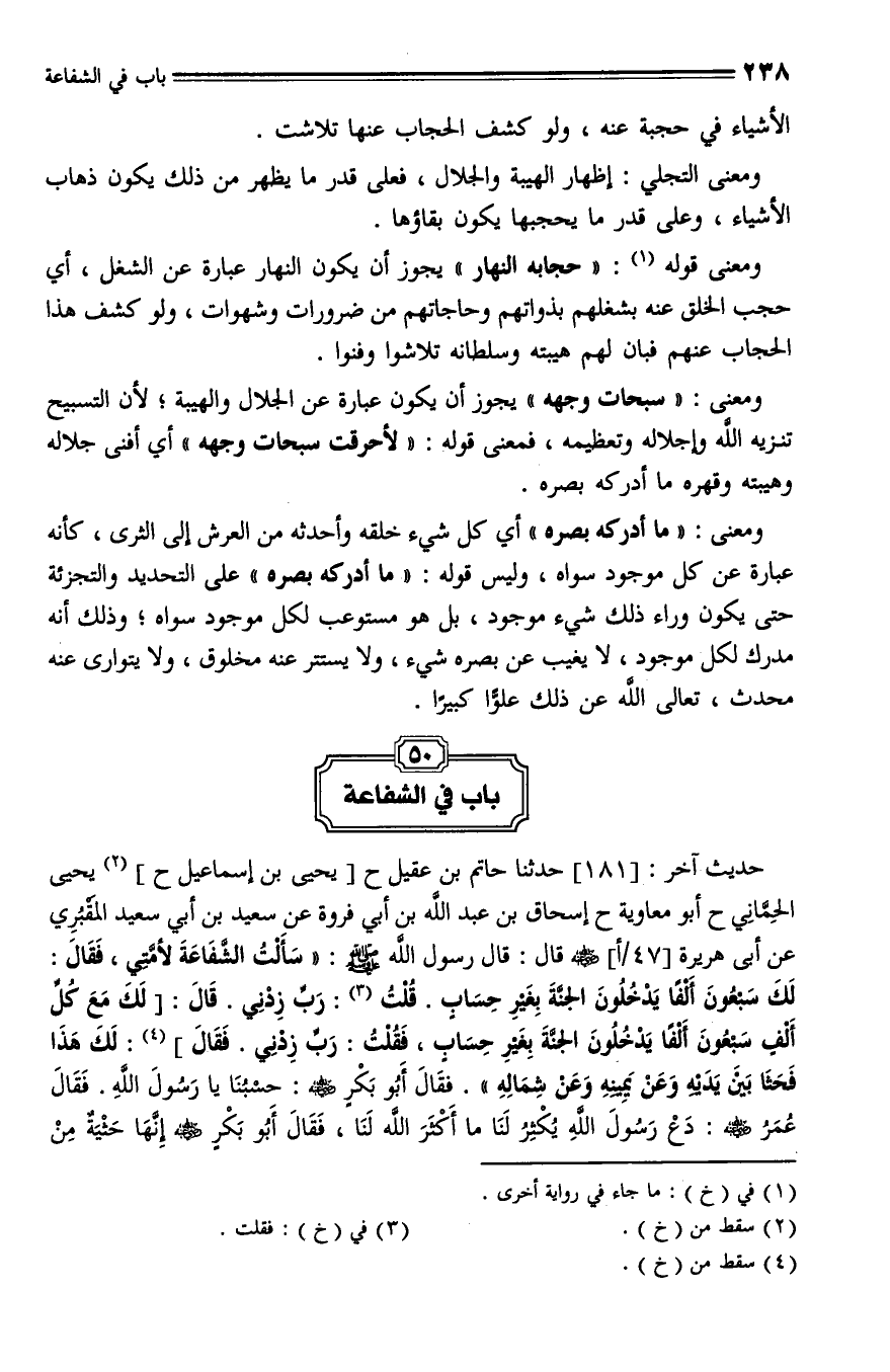 181 - حَدَّثَنَا حَاتِمُ بْنُ عَقِيلٍ، حدثنا يَحْيَى بْنُ إِسْمَاعِيلَ، حَدَّثَنا يَحْيَى الْحِمَّانِيُّ، حَدَّثَنا أَبُو مُعَاوِيَةَ، حَدَّثَنا إِسْحَاقُ بْنُ عَبْدِ اللَّهِ بْنِ أَبِي فَرْوَةَ , عَنْ سَعِيدِ بْنِ أَبِي سَعِيدٍ الْمَقْبُرِيِّ , عَنْ أَبِي هُرَيْرَةَ - رَضِيَ اللَّهُ عَنْهُ - قَالَ: قال رَسُولُ اللَّهِ صلى الله عليه وسلم: " سَأَلْتُ الشَّفَاعَةَ لِأُمَّتِي , فَقال: لَكَ سَبْعُونَ أَلْفًا يَدْخُلُونَ الْجَنَّةَ بِغَيْرِ حِسَابٍ , فَقُلْتُ: رَبِّ زِدْنِي , قال: لَكَ مَعَ كُلِّ أَلْفٍ سَبْعُونَ أَلْفًا يَدْخُلُونَ الْجَنَّةَ بِغَيْرِ حِسَابٍ , فَقُلْتُ: رَبِّ زِدْنِي , فَقال: لَكَ هَذَا , فَجثا بَيْنَ يَدَيْهِ وَعَنْ يَمِينِهِ وَعَنْ شِمَالِهِ , فَقَالَ أَبُو بَكْرٍ رَضِيَ اللَّهُ عَنْهُ: حَسْبُنَا يَا رَسُولَ اللَّهِ , فَقَالَ عُمَرُ - رَضِيَ اللَّهُ عَنْهُ -: دَعْ رَسُولَ اللَّهِ يُكْثِرُ لَنَا مَا أَكْثَرَ اللَّهُ لَنَا , فَقَالَ أَبُو بَكْرٍ - رضي الله عنه -: إِنَّهَا حَثْيَةٌ مِنْ حَثَيَاتِ رَبِّنَا عز وجل , فَقَالَ النَّبِيُّ صلى الله عليه وسلم: صَدَقَ أَبُو بَكْرٍ ".