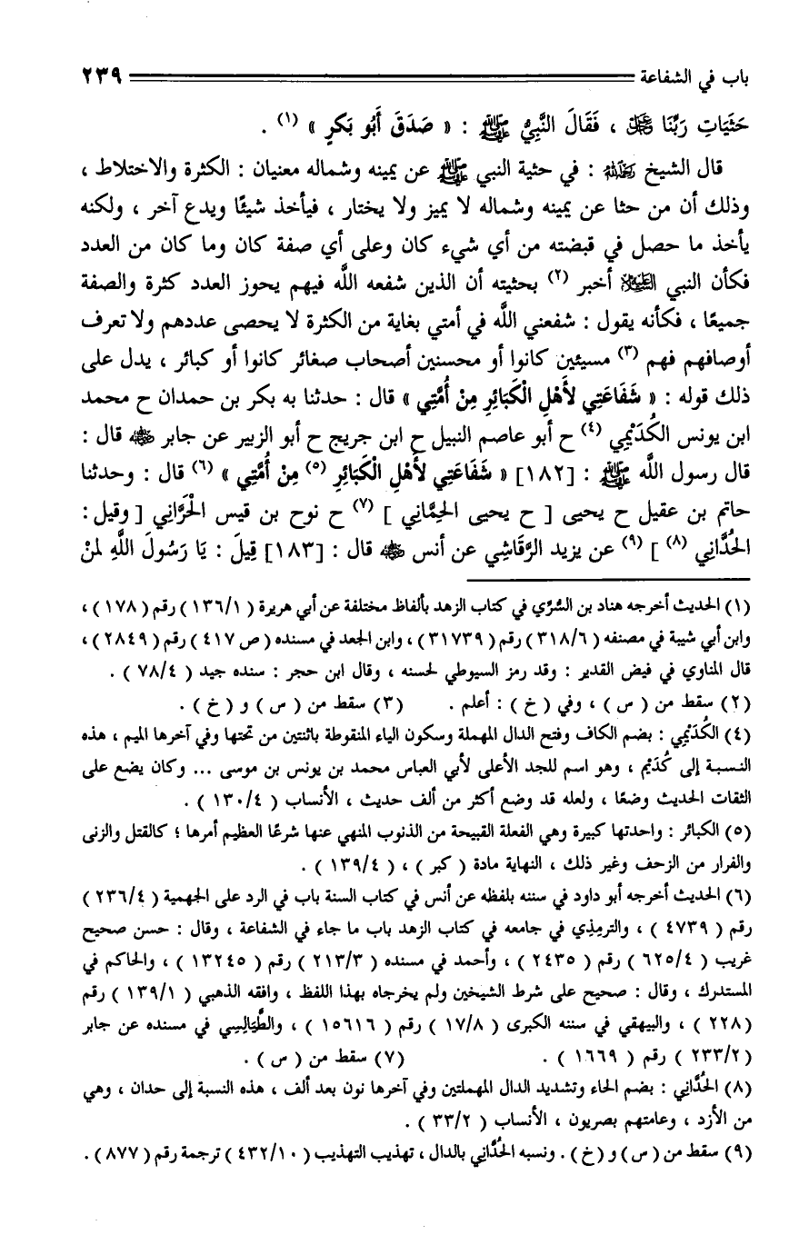 183 - قال: وَحَدَّثَنَا حَاتِمٌ بن عقيل، حَدَّثَنا يَحْيَى، حَدَّثَنا يَحْيَى الحماني، حَدَّثَنا نُوحُ بْنُ قَيْسٍ الْحرَّانِيُّ - وقيل الحُدَّانِي - عَنْ يزيد الرَّقَاشِيِّ الحراني عَنْ أَنَسٍ رَضِيَ اللَّهُ عَنْهُ، قال: " قِيلَ: يَا رَسُولَ اللَّهِ، لِمَنْ تَشْفَعُ؟ قال: لِأَصْحَابِ الدِّمَاءِ وَالْعَظَائِمِ ".