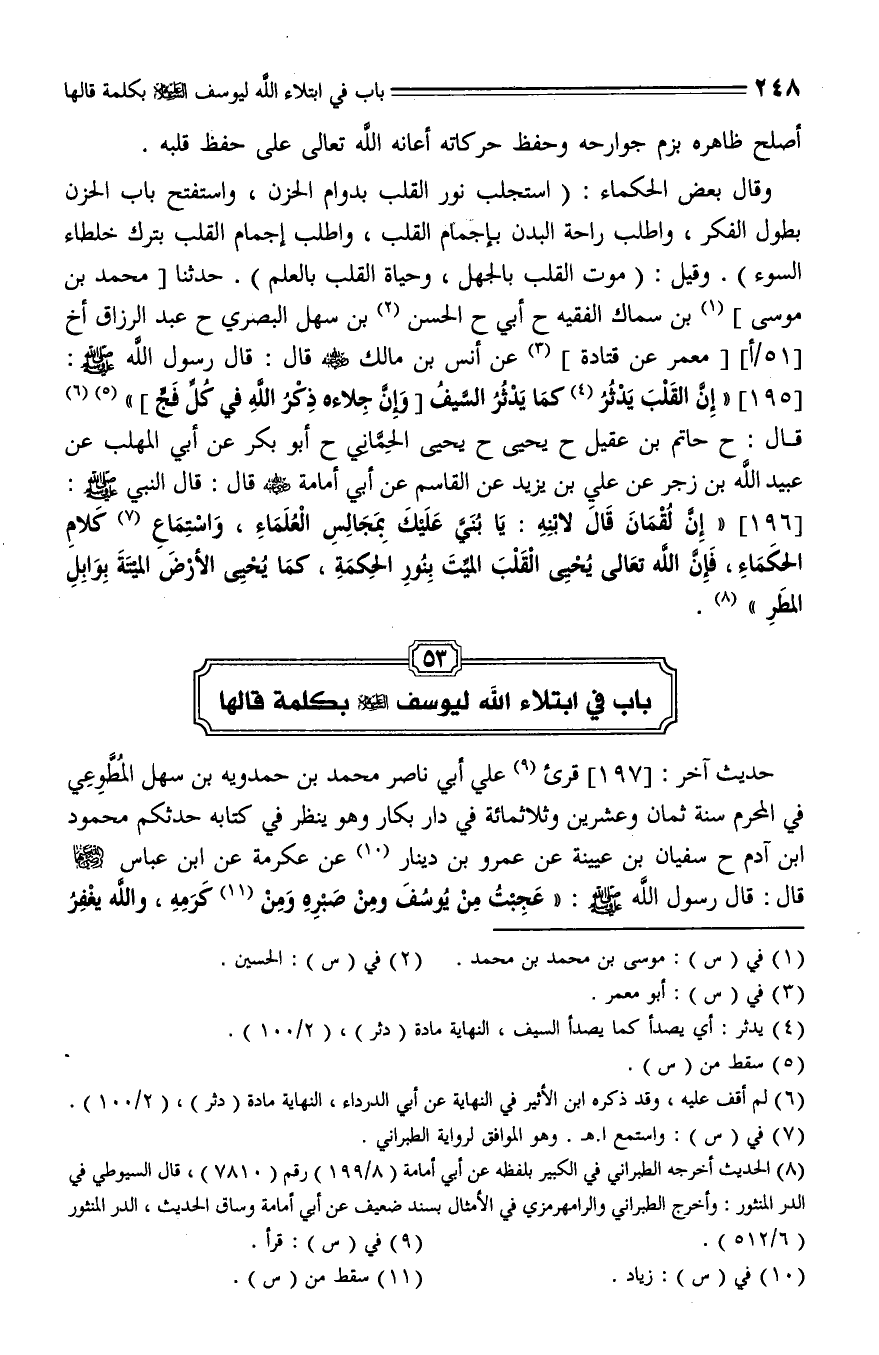 197 - قَالَ الشَّيْخُ: قُرِأ عَلَيَّ أَبُو نَصْرٍ مُحَمَّدُ بْنُ حَمْدَوَيْهِ بْنِ سَهْلٍ الْمُطَّوِعِيُّ فِي الْمُحَرَّمِ سَنَةَ ثَمَانٍ وَعِشْرِينَ وَثَلَاثِمِائَةٍ فِي دَارِ بَكَّارٍ , وَهُوَ يَنْظُرُ فِي كِتَابِهِ، قيل: حَدَّثَكُمْ مَحْمُودُ بْنُ آدَمَ، قال: حَدَّثَنا سُفْيَانُ بْنُ عُيَيْنَةَ , عَنْ عَمْرِو بْنِ دينار , عَنْ عِكْرِمَةَ , عَنِ ابْنِ عَبَّاسٍ رَضِيَ اللَّهُ عَنْهُ، قَالَ: قال رَسُولُ اللَّهِ صلى الله عليه وسلم: " عَجِبْتُ مِنْ يُوسُفَ , وَمِنْ صَبْرِهِ وَمن كَرَمِهِ , وَاللَّهُ يَغْفِرُ لَهُ حين سئل عن البقرات العجاف، كيف أخبر حتى يخرجوه، وَعجبت مِنْ صَبْرِهِ وَكَرَمِهِ وَاللَّهُ يَغْفِرُ لَهُ لَوْ كُنْتُ أَنَا مَكَانَهُ حِينَ أَتَاهُ الرَّسُولُ لَبَدَرْتُهُ الْبَابَ , وَلَكِنَّهُ أَرَادَ أَنْ يَكُونَ لَهُ الْعذْرُ , وَلَوْلَا كَلِمَةٌ قَالَهَا مَا لَبِثَ فِي السِّجْنِ مَا لَبِثَ ".