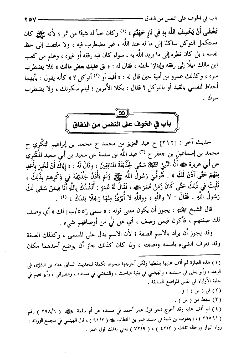 212 - حَدَّثَنَا عَبْدُ الْعَزِيزِ بْنُ مُحَمَّدٍ، حَدَّثَنا مُحَمَّدُ بْنُ إِبْرَاهِيمَ الْبَكْرِيُّ، حَدَّثَنا مُحَمَّدُ بْنُ إِسْمَاعِيلَ بْنِ جَعْفَرٍ , عَنْ عَبْدِ اللِّهِ بْنِ سَلَمَةَ , عَنْ سَعِيدِ بن أبي سعيد الْمَقْبُرِيِّ , عَنْ أَبِي هُرَيْرَةَ - رضي الله عنه - " أَنَّ النبي عليه السلام سَمَّى لِحُذَيْفَةَ الْمُنَافِقِينَ , وَقَالَ لَهُ: إِيَّاكَ أَنْ تُخْبِرَ بأَحَد مِنْهُمْ , حَتَّى آَذَنَ لَكَ , فَتُوُفِّيَ رَسُولُ اللَّهِ عليه السلام , وَلَمْ يَأْذَنْ لِحُذَيْفَةَ فِي ذِكْرِهِمْ بِذَلِكَ , فَلَبِثَ في ذلك حَتَّى كَانَ زَمَنُ عُمَرَ رَضِيَ اللَّهُ عَنْهُ , فَقَالَ له عُمَرُ: أَنْشُدُكَ اللَّهَ أَنَا فِيمَنْ سَمَّى لَكَ رَسُولُ اللَّهِ؟ فَقال: لَا وَاللَّهِ , ووَاللَّهِ لَا أُبَرِّئُ مِنْهَا رَجُلًا بَعْدَكَ ".