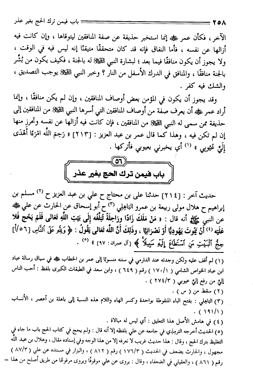214 - حَدَّثَنَا عَلِيُّ بْنُ مُحْتَاجٍ , حَدَّثَنا عَلِيُّ بْنُ عَبْدِ الْعَزِيزِ، حَدَّثَنا مُسْلِمُ بْنُ إِبْرَاهِيمَ، حَدَّثَنا هِلَالٌ مَوْلَى رَبِيعَةَ بْنِ عَمْرٍو الْبَاهِلِيِّ، حَدَّثَنا أَبُو إِسْحَاقَ , عَنِ الْحَارِثِ , عَنْ عَلِيِّ , رَضِيَ اللَّهُ عَنْهُ , عَنِ النَّبِيِّ صلى الله عليه وسلم، أنه قال: " مَنْ مَلَكَ زَادًا وَرَاحِلَةً يُبَلِّغُهُ إِلَى بَيْتِ اللَّهِ تعالى فَلَمْ يَحُجَّ فَلَا عَلَيْهِ أَنْ يَمُوتَ يَهُودِيًّا أَوْ نَصْرَانِيًّا , وَذَلِكَ أَنَّ اللَّهَ تَعَالَى يَقُولُ {وَلِلَّهِ عَلَى النَّاسِ حِجُّ الْبَيْتِ مَنِ اسْتَطَاعَ إِلَيْهِ سَبِيلًا} ".