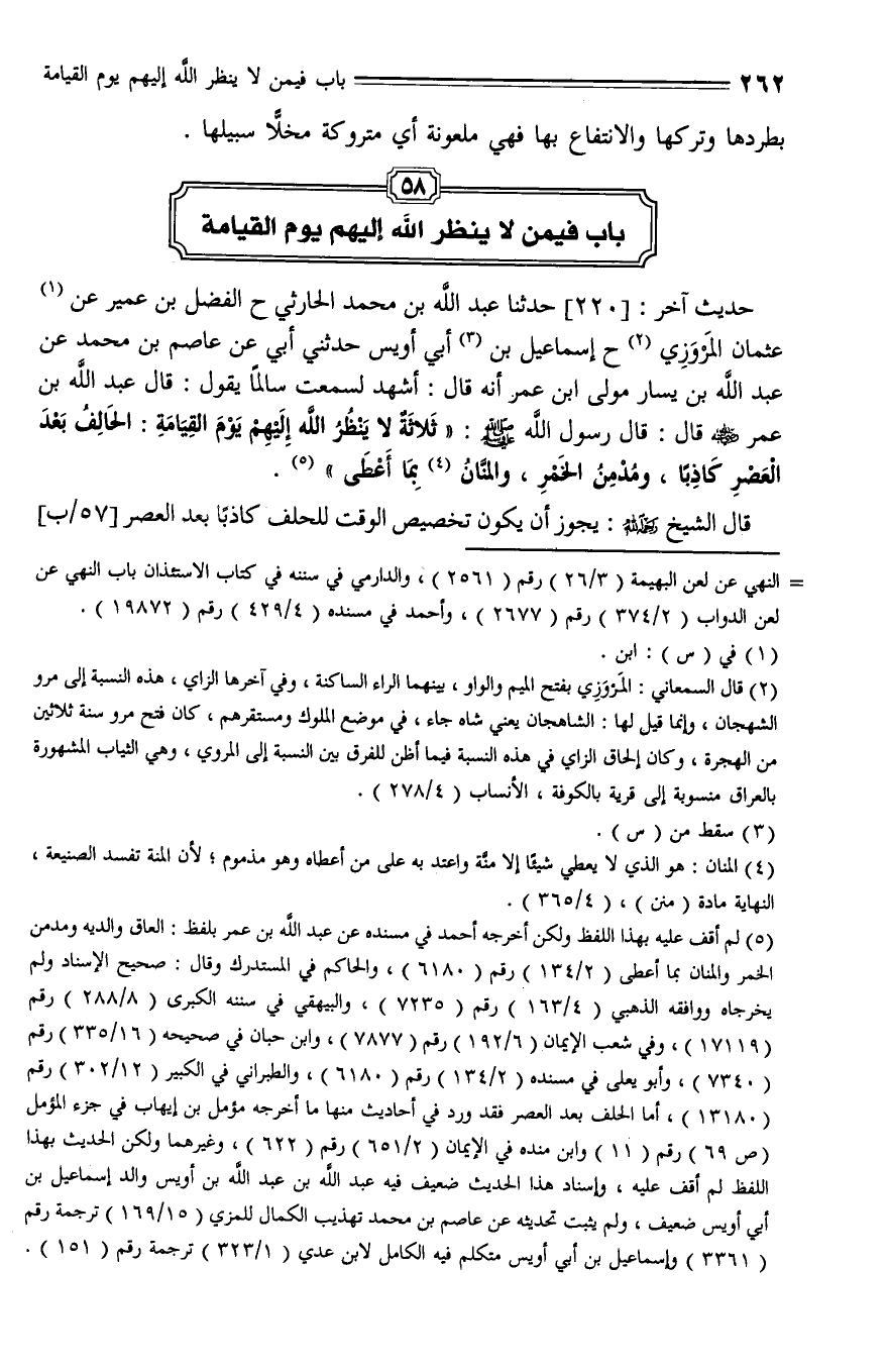 220 - حدثنا عبد الله بن محمد الحارثي، حَدَّثَنَا الْفَضْلُ بْنُ عُمَيْرِ بْنِ عُثْمَانَ الْمَرْوَزِيُّ , حَدَّثَنا إِسْمَاعِيلُ بْنُ أَبِي أُوَيْسٍ، حَدَّثَني أَبِي , عَنْ عَاصِمِ بْنِ مُحَمَّدٍ , عَنْ عَبْدِ اللَّهِ بْنِ يَسَارٍ , مَوْلَى ابْنِ عُمَرَ، أَنَّهُ قال: أَشْهَدُ لَسَمِعْتُ سَالِمًا يَقُولُ: قَالَ عَبْدُ اللَّهِ بْنُ عُمَرَ، رَضِيَ اللَّهُ عَنْهُ: قَالَ رَسُولُ اللَّهِ - صلى الله عليه وسلم -: " ثَلَاثَةٌ لَا يَنْظُرُ اللَّهُ إِلَيْهِمْ يَوْمَ الْقِيَامَةِ: الْحَالِفُ بَعْدَ الْعَصْرِ كَذِبًا , وَمُدْمِنُ الْخَمْرِ , وَالْمَنَّانُ بِمَا أَعْطَى ".