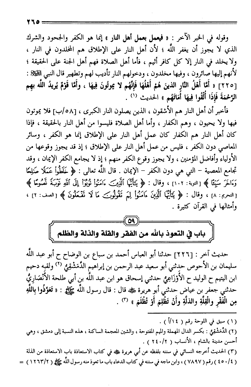 226 - حَدَّثَنَا أَبُو الْعَبَّاسِ أَحْمَدُ بْنُ سِبَاعِ بْنِ الْوَضَّاحِ، حَدَّثَنا أَبُو عَبْدِ اللَّهِ سُلَيْمَانُ بْنُ الْأَحْوَصِ، حَدَّثَني أَبُو سَعِيدٍ عَبْدُ الرَّحْمَنِ بْنُ إِبْرَاهِيمَ الدِّمَشْقِيُّ وَلَقَبُهُ دُحَيْمُ بْنُ الْيَتِيمِ، حَدَّثَنا الْوَلِيدُ، حَدَّثَنا الْأَوْزَاعِيُّ، حَدَّثَنا إِسْحَاقُ هُوَ ابْنُ عَبْدِ اللَّهِ بْنِ أَبِي طَلْحَةَ الْأَنْصَارِيُّ، حَدَّثَني (ق60أ) جَعْفَرُ بْنُ عِيَاضٍ، حَدَّثَني أَبُو هُرَيْرَةَ، قَالَ: قال رَسُولُ اللَّهِ صلى الله عليه وسلم: " تَعَوَّذُوا بِاللَّهِ مِنَ الْفَقْرِ وَالْقِلَّةِ وَالذِّلَّةِ، وَأَنْ تَظْلِمَ وَتُظْلَمَ ".