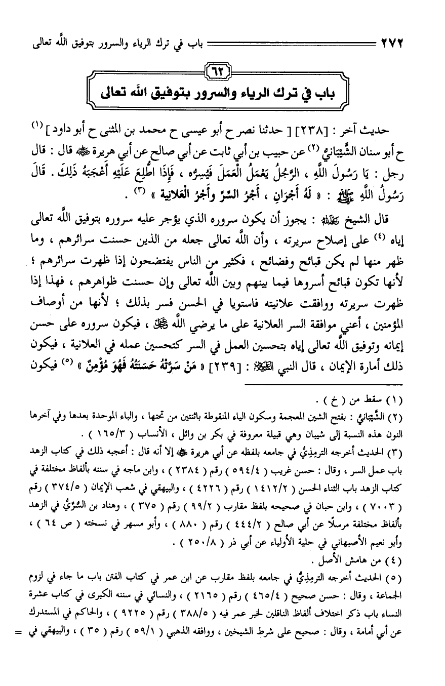 238 - حَدَّثَنَا نَصْرٌ، حَدَّثَنا أَبُو عِيسَى، حَدَّثَنا مُحَمَّدُ بْنُ الْمُثَنَّى، حَدَّثَنا أَبُو دَاوُدَ، حَدَّثَنا أَبُو سِنَانٍ الشَّيْبَانِيُّ , عَنْ حَبِيبِ بْنِ أَبِي ثَابِتٍ , عَنْ أَبِي صَالِحٍ , عَنْ أَبِي هُرَيْرَةَ - رضي الله عنه - قال: قَالَ رَجُلٌ: يَا رَسُولَ اللَّهِ، الرَّجُلُ يَعْمَلُ الْعَمَلَ فَيُسِرُّهُ , فَإِذَا اطَّلَعَ عَلَيْهِ أَعْجَبَهُ ذلك , قَالَ رَسُولُ اللَّهِ صلى الله عليه وسلم (ق62ب): " لَهُ أَجْرَانِ: أَجْرُ السِّرِّ , وَأَجْرُ الْعَلَانِيَةِ ".