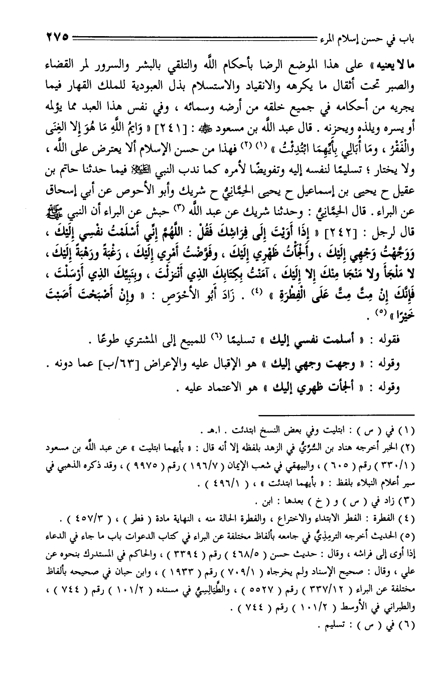 242 - حَدَّثَنَا حَاتِمُ بْنُ عَقِيلٍ , حَدَّثَنا يَحْيَى بْنُ إِسْمَاعِيلَ، حَدَّثَنا يَحْيَى الْحِمَّانِيُّ، حَدَّثَنا شَرِيكٌ , وَأَبُو الْأَحْوَصِ , عَنْ أَبِي إِسْحَاقَ , عَنِ الْبَرَاءِ - قَالَ الْحِمَّانِيُّ: وَحَدَّثَنا شَرِيكٌ , عَنْ عَبْدِ اللَّهِ بْنِ حَبَشِيٍّ , عَنِ الْبَرَاءِ , أَنَّ النبي صلى اللَّهِ عليه وسلم , قَالَ لِرَجُلٍ: إِذَا آوَيْتَ إِلَى فِرَاشِكِ , فَقُلِ: اللَّهُمَّ إِنِّي أَسْلَمْتُ نَفْسِي إِلَيْكَ , وَوَجَّهْتُ وَجْهِي إِلَيْكَ , وَأَلْجَأْتُ ظَهْرِي إِلَيْكَ , وَفَوَّضْتُ أَمْرِي إِلَيْكَ , رَغْبَةً , وَرَهْبَةً إِلَيْكَ , لَا مَلْجَأَ وَلا مَنْجَا مِنْكَ إِلَّا إِلَيْكَ , آمَنْتُ بِكِتَابِكَ الَّذِي أَنْزَلْتَ , وَبنَبِيِّكَ الَّذِي أَرْسَلْتَ , فَإِنَّكَ إِنْ مِتَّ مِتَّ عَلَى الْفِطْرَةِ ". زَادَ أَبُو الْأَحْوَصِ: " وَإِنَّ أَصْبَحْتَ أَصَبْتَ خَيْرًا ".