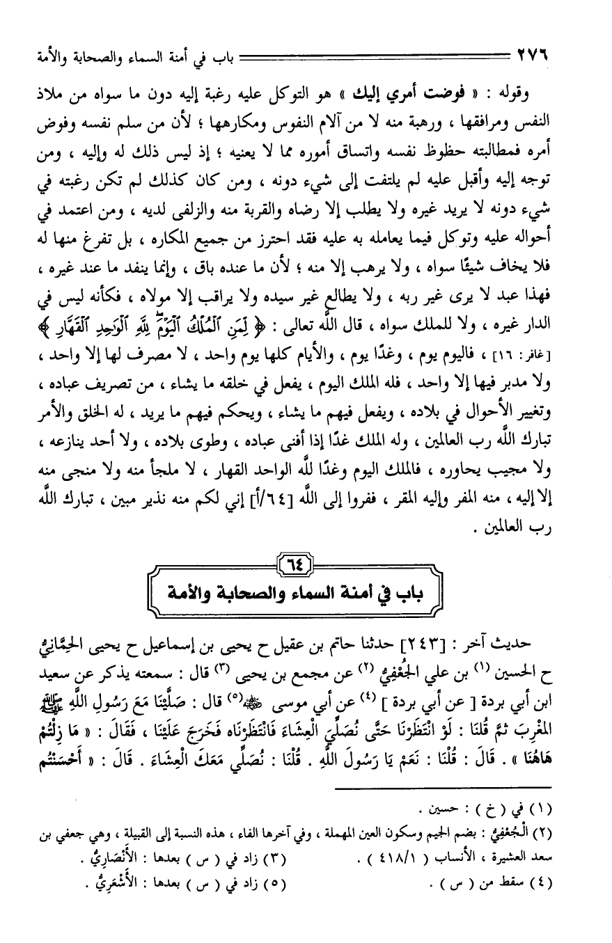 243 - حَدَّثَنَا حَاتِمُ بْنُ عَقِيلٍ , حَدَّثَنا يَحْيَى بْنُ إِسْمَاعِيلَ، حَدَّثَنا يَحْيَى الْحِمَّانِيُّ، حَدَّثَنا الْحُسَيْنُ بْنُ عَلِيِّ الْجُعْفِيِّ , عَنْ مُجَمِّعِ بْنِ يَحْيَى الْأَنْصَارِيِّ، قال: سَمِعْتُهُ يَذْكُرُ عَنْ سَعِيدِ بْنِ أَبِي بُرْدَةَ , عَنْ أَبِي مُوسَى الْأَشْعَرِيِّ رَضِيَ اللَّهُ عَنْهُ، قال: " صَلَّيْنَا مَعَ رَسُولِ اللَّهِ - صلى الله عليه وسلم - الْمَغْرِبَ , ثُمَّ قُلْنَا: لَوِ انْتَظَرْنَا , حَتَّى نُصَلِّيَ مَعَهُ الْعِشَاءَ , فَانْتَظَرْنَاهُ , فَخَرَجَ عَلَيْنَا فَقال: مَا زِلْتُمْ هَاهُنَا؟، قُلْنَا: نَعَمْ يَا رَسُولَ اللَّهِ , قلنا: نُصَلِّي مَعَكَ الْعِشَاءَ، قال: " أَحْسَنْتُمْ أَوْ أَصبتُمْ " , ثُمَّ رَفَعَ رَأْسَهُ إِلَى السَّمَاءِ , وَكَانَ كَثِيرًا مَا يَرْفَعُ رَأْسَهُ إِلَى السَّمَاءِ، فقال: " النُّجُومُ أَمَنَةٌ لِأَهْلِ السَّمَاءِ , فَإِذَا ذَهَبْتِ النُّجُومُ أَتَى أَهْلَ السَّمَاءِ مَا يُوعَدُونَ , وَأَنَا أَمَنَةٌ لِأَصْحَابِي , فَإِذَا ذَهَبْتُ أَنَا أَتَى أَصْحَابِي مَا يُوعَدُونَ , وَأَصْحَابِي أَمَنَةٌ لِأُمَّتِي , فَإِذَا ذَهَبَ أَصْحَابِي أَتَى أُمَّتِي مَا يُوعَدُونَ ".