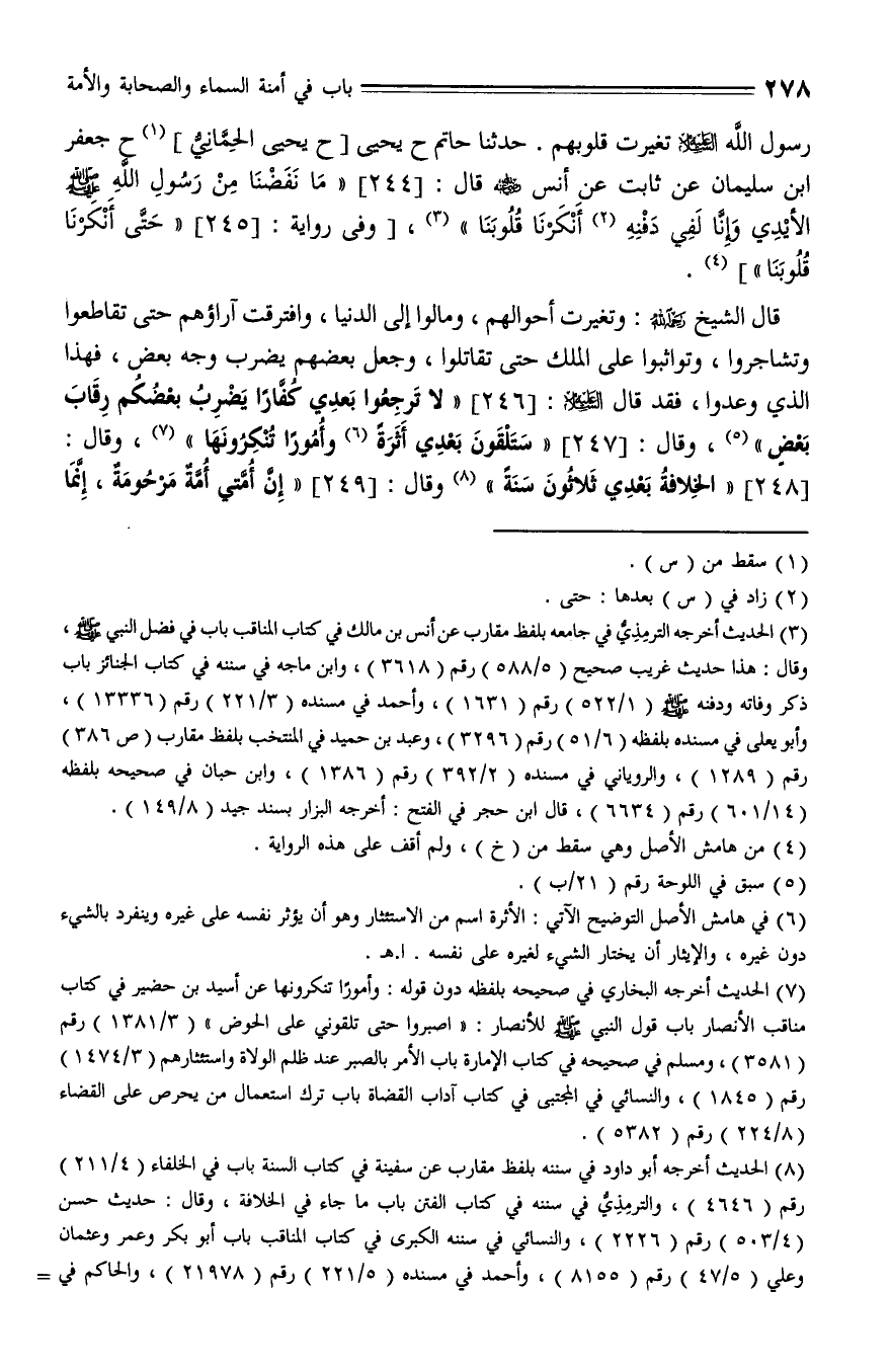 244 - حَدَّثَنَا حَاتِمٌ , حَدَّثَنا يَحْيَى، حَدَّثَنا جَعْفَرُ بْنُ سُلَيْمَانَ , عَنْ ثَابِتٍ , عَنْ أَنَسِ بْنِ مَالِكٍ رَضِيَ اللَّهُ عَنْهُ، " مَا نَفَضْنَا مِنْ رَسُولِ اللَّهِ - صلى الله عليه وسلم - الْأَيْدِيَ , وَإِنَّا لَفِي دَفْنِهِ حَتَّى أَنْكَرْنَا قُلُوبَنَا ".