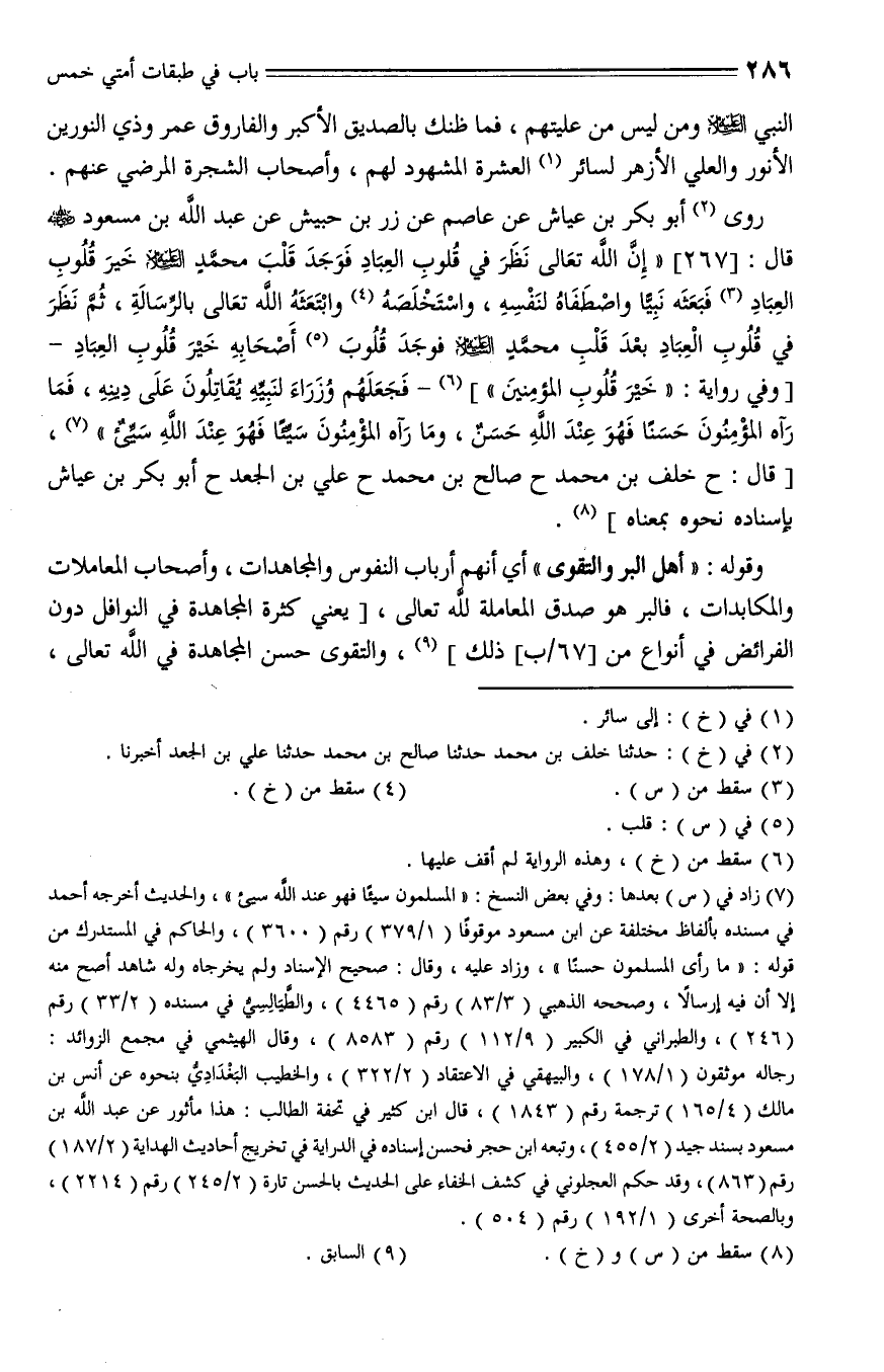 267 - حدثنا خلف بن محمد، حدثنا صالح بن محمد، حدثنا علي بن الجعد، أخبرنا أَبُو بَكْرِ بْنُ عَيَّاشٍ , عَنْ عَاصِمٍ , عَنْ ذَرِّ بْنِ حُبَيْشٍ , عَنْ عَبْدِ اللَّهِ بْنِ مَسْعُودٍ , قال: " إِنَّ اللَّهَ تَعَالَى نَظَرَ فِي قُلُوبِ الْعِبَادِ فَوَجَدَ قَلْبَ مُحَمَّدٍ - عليه السلام - خَيْرَ الْقُلُوبِ , فَبَعَثَهُ نَبِيًّا , وَاصْطَفَاهُ لِنَفْسِهِ , وَاسْتَخْلَصَهُ , وَابتَعَثَه الله تعالى بِالرِّسَالَةِ , ثُمَّ نَظَرَ فِي قُلُوبِ الْعِبَادِ بَعْدَ قَلْبِ مُحَمَّدٍ - عليه السلام - فَوَجَدَ قلوبَ أَصْحَابِهِ خَيْرَ قُلُوبِ الْعِبَادِ - وفي رواية "خيرَ قُلُوبِ المؤمنين " - فَجَعَلَهُمْ وُزَرَاءَ لِنَبِيِّهِ، يُقَاتِلُونَ عَلَى دِينِهِ , فَمَا رَآهُ الْمُؤْمِنُونَ حَسَنًا فَهُوَ عِنْدَ اللَّهِ حَسَنٌ , وَمَا رَآهُ الْمُؤْمِنُونَ سَيِّئًا فَهُوَ عِنْدَ اللَّهِ سَيِّئٌ ".