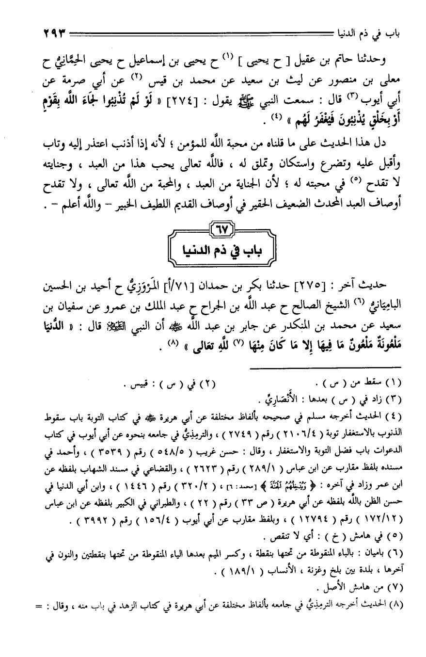 274 - وحَدَّثَنَا حَاتِمُ بْنُ عَقِيلٍ , حَدَّثَنا يَحْيَى بْنُ إِسْمَاعِيلَ، حَدَّثَنا يَحْيَى الْحِمَّانِيُّ، حَدَّثَنا مُعَلَّى بْنُ مَنْصُورٍ , عَنْ لَيْثِ بْنِ سَعْدٍ , عَنْ مُحَمَّدِ بْنِ قَيْسٍ , عَنْ أَبِي صِرْمَّةَ , عَنْ أَبِي أَيُّوبَ، قال: سَمِعْتُ النَّبِيَّ صلى الله عليه وسلم، يَقُولُ: " لَوْ لَمْ تُذْنِبُوا لَجَاءَ اللَّهُ بِقَوْمٍ أَوْ بِخَلْقٍ يُذْنِبُونَ فَيَغْفِرُ لَهُمْ ".