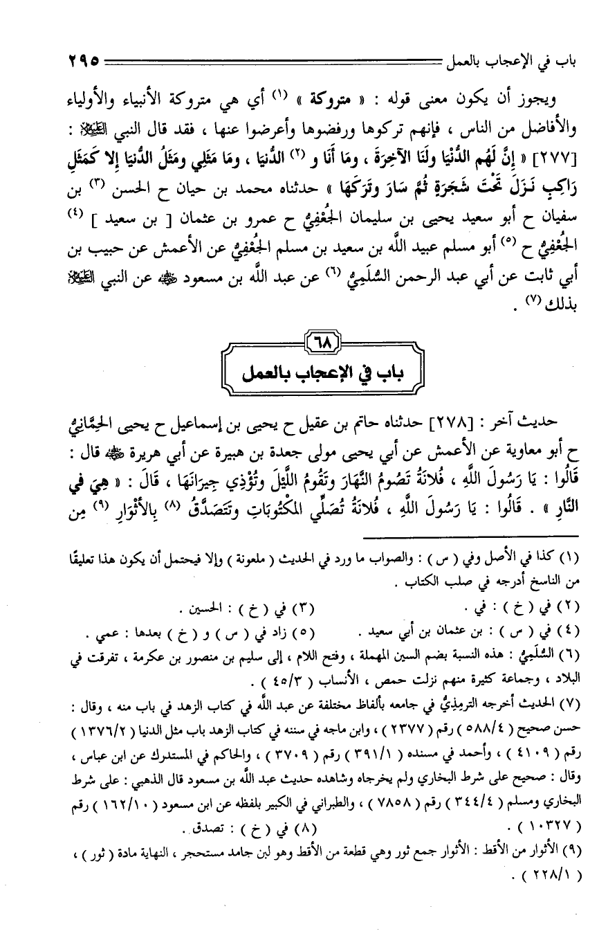 277 - حَدَّثَنَا مُحَمَّدُ بْنُ حَيَّانَ، حَدَّثَنا الْحَسَنُ بْنُ سُفْيَانَ، حَدَّثَنا أَبُو سَعِيدٍ يَحْيَى بْنُ سُلَيْمَانَ (ق71ب) الْجُعْفِيُّ، حدثنا عمرو بن عثمان بن سعيد الجُعْفِيُّ، حَدَّثَنا عَمِّي أَبُو مُسْلِمٍ عُبَيْدُ اللَّهِ بْنُ سَعِيدِ بْنِ مُسْلِمٍ الْجُعْفِيُّ , عَنِ الْأَعْمَشِ , عَنْ حَبِيبِ بْنِ أَبِي ثَابِتٍ , عَنْ أَبِي عَبْدِ الرَّحْمَنِ السُّلَمِيِّ , عَنْ عَبْدِ اللَّهِ بْنِ مَسْعُودٍ , عَنِ النَّبِيِّ - عليه السلام - قال: " إِنَّ لَهُمُ الدُّنْيَا وَلَنَا الْآخِرَةَ , وَمَا أَنَا وَالدُّنْيَا ومَا مَثَلِي وَمَثَلُ الدُّنْيَا إِلَّا كَمَثَلِ رَاكِبٍ نَزَلَ تَحْتَ شَجَرَةٍ , ثُمَّ سَارَ وَتَرَكَهَا ".
