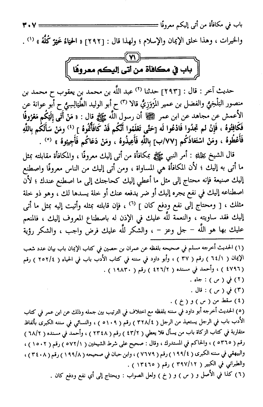 293 - حدثنا عَبْدُ اللَّهِ بْنُ مُحَمَّدِ بْنِ يَعْقُوبَ، حَدَّثَنا مُحَمَّدُ بْنُ مَنْصُورٍ الْبَلْخِيُّ , وَالْفَضْلُ بْنُ عُمَيْرٍ الْمَرْوَزِيُّ، قالا: حَدَّثَنا أَبُو الْوَلِيدِ الطَّيَالِسِيُّ، حَدَّثَنا أَبُو عَوَانَةَ , عَنِ الْأَعْمَشِ , عَنْ مُجَاهِدٍ , عَنِ ابْنِ عُمَرَ , رَضِيَ اللَّهُ عَنْهُمَا , أَنَّ رَسُولَ اللَّهِ صلى الله عليه وسلم، قال: " مَنْ أَتَى إِلَيْكُمْ مَعْرُوفًا فَكَافِئُوهُ , فَإِنْ لَمْ تَجِدُوا فَادْعُوا لَهُ حتى تعلموا أنكم قد كافأتموه , وَمَنْ سَأَلَكُمْ بِاللَّهِ فَأَعْطُوهُ , وَمَنِ اسْتَعَاذَكُمْ بِاللَّهِ فَأَعِيذُوهُ , وَمَنْ دَعَاكُمْ فَأَجِيبُوهُ ".