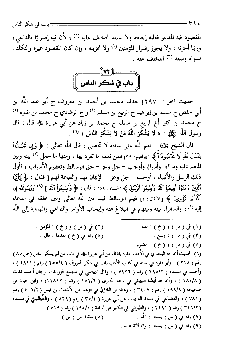 297 - حَدَّثَنَا مُحَمَّدُ بْنُ أَحْمَدَ بْنِ مَعْرُوفٍ، حَدَّثَنا أَبُو عَبْدِ اللَّهِ بْنُ أَبِي حَفْصٍ، حَدَّثَنا مُسْلِمُ بْنُ إِبْرَاهِيمَ، حَدَّثَنا الرَّبِيعُ بْنُ مُسْلِمٍ (ح) وَحَدَّثَنَا الرَّشَادِيُّ، حَدَّثَنا مُحَمَّدُ بْنُ ضوء، حَدَّثَنا مُحَمَّدُ بْنُ كَثِيرٍ، حَدَّثَنا الرَّبِيعُ مسلم، حَدَّثَنا مُحَمَّدُ بْنُ زِيَادٍ , عَنْ أَبِي هُرَيْرَةَ - رضي الله عنه - قَالَ: قال رَسُولُ اللَّهِ صلى الله عليه وسلم: " لَا يَشْكُرُ اللَّهَ مَنْ لَا يَشْكُرُ النَّاسَ ".