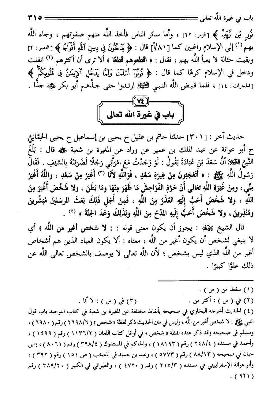 301 - حَدَّثَنَا حَاتِمٌ بن عقيل، حَدَّثَنا يَحْيَى بن إسماعيل، حَدَّثَنا يَحْيَى الحماني، حَدَّثَنا أَبُو عَوَانَةَ , عَنْ عَبْدِ الْمَلِكِ بْنِ عُمَيْرٍ , عَنْ وَرَّادٍ , عَنِ الْمُغِيرَةِ بْنِ شُعْبَةَ رَضِيَ اللَّهُ عَنْهُ، بَلَغَ النَّبِيَّ عليه السلام أَنَّ سَعْدَ بْنَ عُبَادَةَ رَضِيَ اللَّهُ عَنْهُ يَقُولُ: لَوْ وَجَدْتُ مَعَ امْرَأَتِي رَجُلًا لَضَرَبْتُهُ بِالسَّيْفِ , فَقَالَ رسول الله: " أَتَعْجَبُونَ مِنْ غَيْرَةِ سَعْدٍ , فَوَاللَّهِ لَأَنَا أَغْيَرُ مِنْ سَعْدٍ , وَاللَّهُ أَغْيَرُ مِنِّي , وَمِنْ غَيْرَةِ اللَّهِ أن حَرَّمَ الْفَوَاحِشَ مَا ظَهَرَ مِنْهَا وَمَا بَطَنَ , وَلَا شَخَصَ أَغْيَرُ مِنَ اللَّهِ , وَلَا شَخَصَ أَحَبُّ إِلَيْهِ الْعُذْرُ مِنَ اللَّهِ , فَمِنْ أَجْلِ ذَلِكَ بَعَثَ الْمُرْسَلِينَ مُبَشِّرِينَ , وَمُنْذِرِينَ , وَلَا شَخَصَ أَحَبُّ إِلَيْهِ الْمَدْحُ مِنَ اللَّهِ , وَلِذَلِكَ وَعَدَ الْجَنَّةَ ".