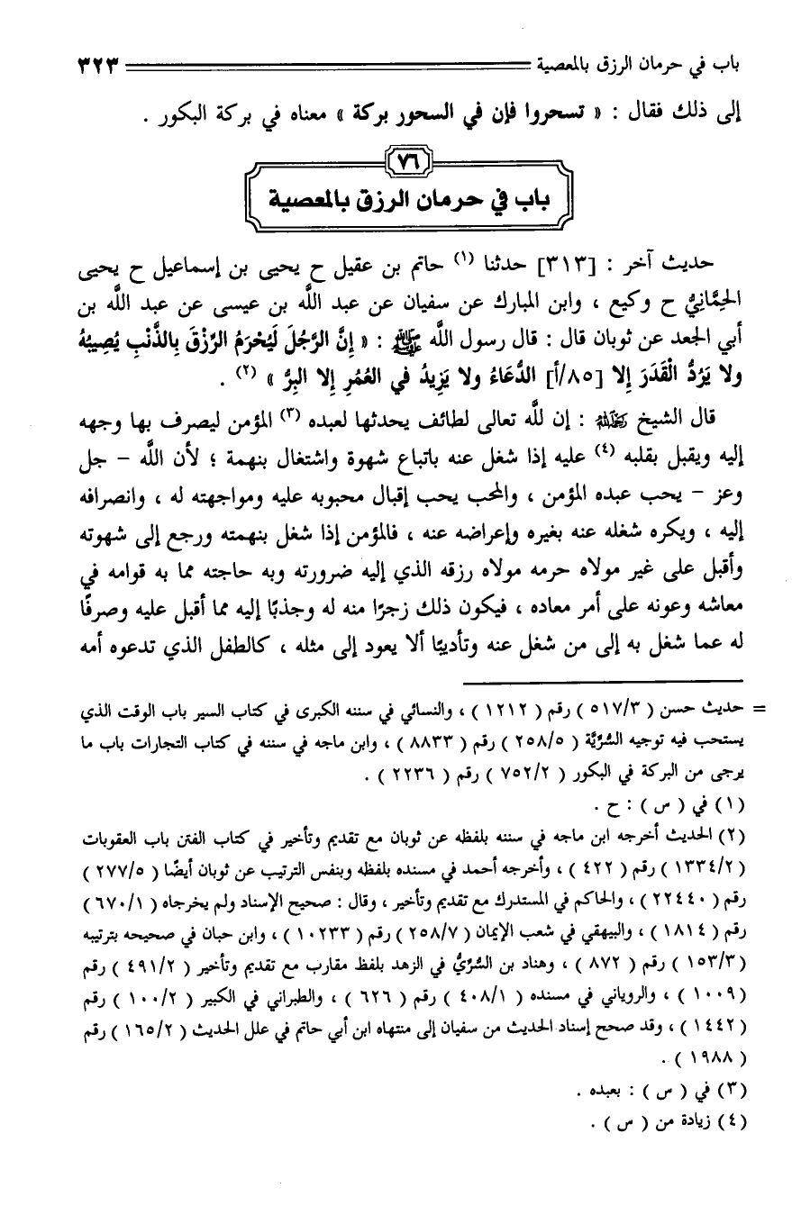 313 - حَدَّثَنَا حَاتِمُ بْنُ عَقِيلٍ , حَدَّثَنا يَحْيَى بْنُ إِسْمَاعِيلَ، حَدَّثَنا يَحْيَى الْحِمَّانِيُّ، حَدَّثَنا وَكِيعٌ , وَابْنُ الْمُبَارَكِ , عَنْ سُفْيَانَ , عَنْ عَبْدِ اللَّهِ بْنِ عِيسَى , عَنْ عَبْدِ اللَّهِ بْنِ أَبِي الْجَعْدِ , عَنْ ثَوْبَانَ، قال: قَالَ رَسُولُ اللَّهِ عليه السلام: " إِنَّ الرَّجُلَ ليُحْرَمُ الرِّزْقَ بِالذَّنْبِ يُصِيبُهُ , وَلَا يَرُدُّ الْقَدَرَ إِلَّا الدُّعَاءُ , وَلَا يَزِيدُ فِي الْعُمُرِ إِلَّا الْبِرُّ ".
