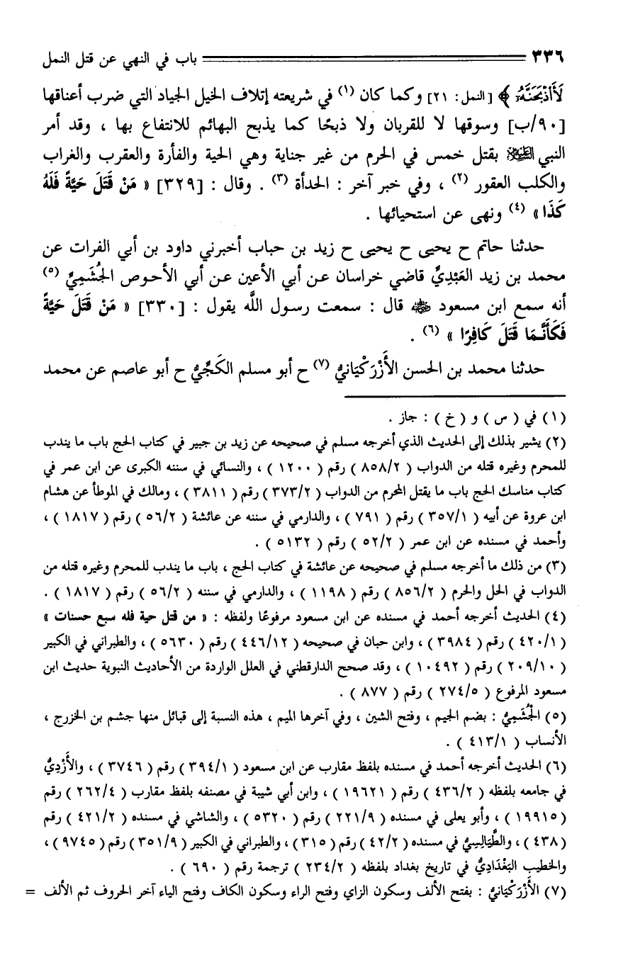330 - وَحَدَّثَنَا حَاتِمٌ , حَدَّثَنا يَحْيَى، حَدَّثَنا يَحْيَى، حَدَّثَنا زَيْدُ بْنُ حُبَابٍ، حَدَّثَنا داود بْنُ أَبِي الْفُرَاتِ , عَنْ مُحَمَّدِ بْنِ زيدٍ الْعَبْدِيِّ قَاضِي خُرَاسَانَ , عَنْ أَبِي الْأَعْيَنِ , عَنْ أَبِي الْأَحْوَصِ الْجُشَمِيِّ، أَنَّهُ سَمِعَ ابْنَ مَسْعُودٍ رَضِيَ اللَّهُ عَنْهُ، قال: سَمِعْتُ رَسُولَ اللَّهِ عليه السلام، يَقُولُ: " مَنْ قَتَلَ حَيَّةً , فَكَأَنَّمَا قَتَلَ كَافِرًا ".