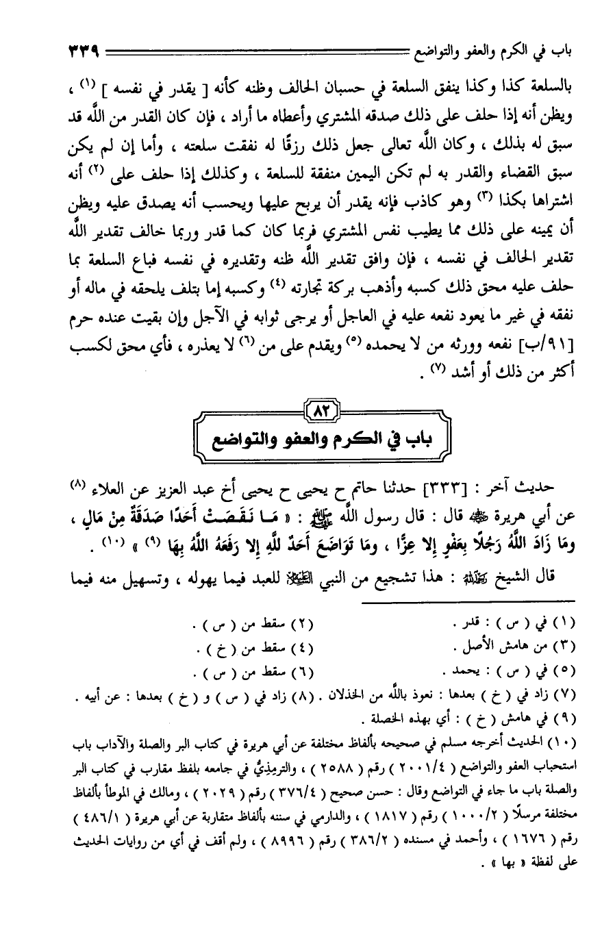 333 - حَدَّثَنَا حَاتِمٌ ,، حَدَّثَنا يَحْيَى، حَدَّثَنا يَحْيَى، أخبرنا عَبْدُ الْعَزِيزِ , عَنِ الْعَلَاءِ , عَنْ أَبِيهِ , عَنْ أَبِي هُرَيْرَةَ - رضي الله عنه - قال: قَالَ رَسُولُ اللَّهِ صلى الله عليه وسلم: " مَا نَقَصَتْ أَحَدًا صَدَقَةٌ مِنْ مَالٍ , وَمَا زَادَ اللَّهُ رَجُلًا يَعْفُو إِلَّا عِزًّا , وَمَا تَوَاضَعَ أَحَدٌ لِلَّهِ إِلَّا رَفَعَهُ اللَّهُ بِهَا ".