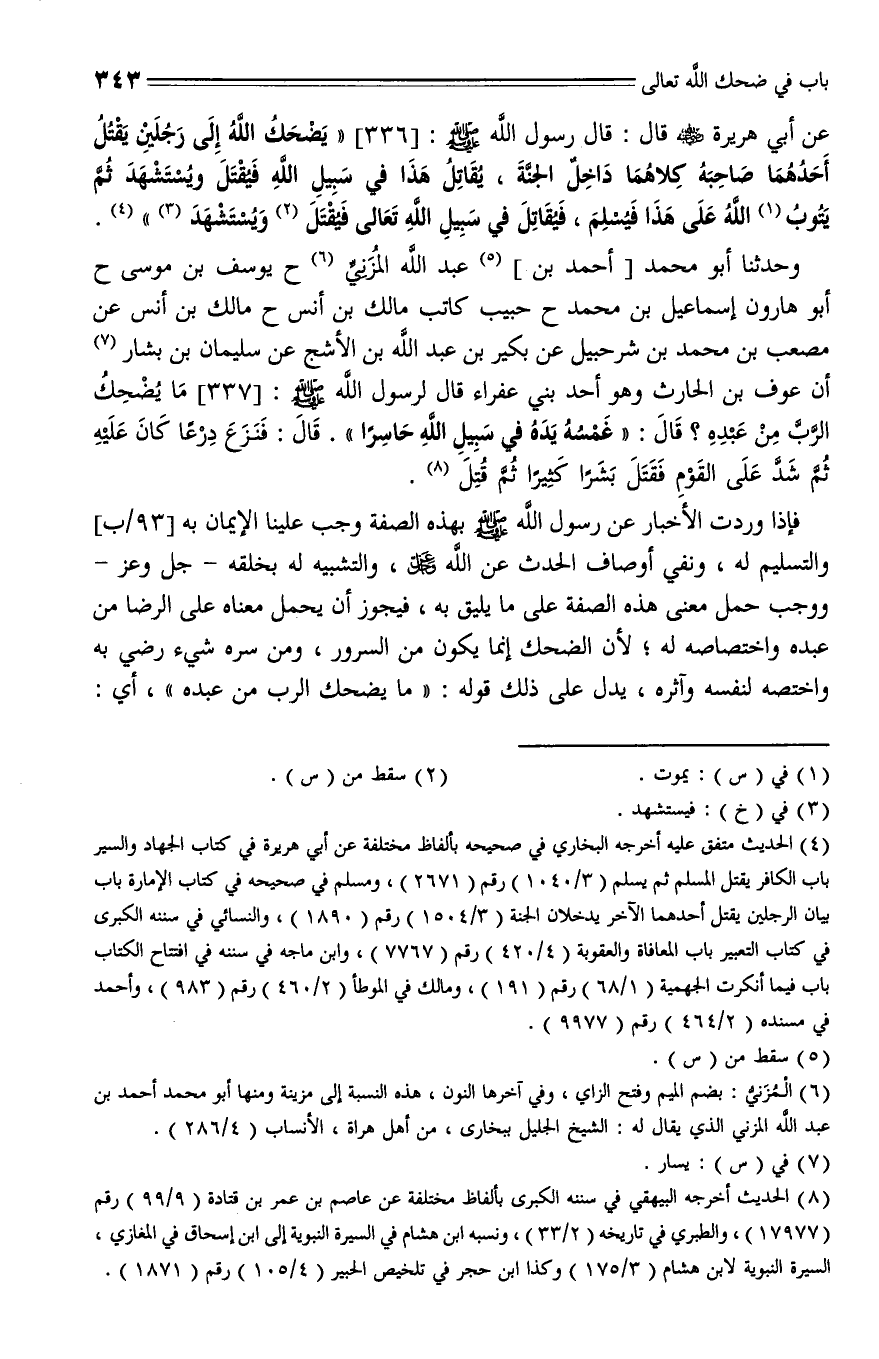 337 - وَحَدَّثَنَا أَبُو مُحَمَّدٍ أحمد بن عَبْدُ اللَّهِ الْمُزَنِيُّ , حَدَّثَنا يُوسُفُ بْنُ مُوسَى، حَدَّثَنا أَبُو هَارُونَ إِسْمَاعِيلُ بْنُ مُحَمَّدٍ، حَدَّثَنا حَبِيبٌ كَاتِبُ مَالِكِ بْنِ أَنَسٍ، حَدَّثَنا مَالِكُ بْنُ أَنَسٍ , عَنْ مُصْعَبِ بْنِ مُحَمَّدِ بْنِ شُرَحْبِيلَ , عَنْ بُكَيْرِ بْنِ عَبْدِ اللَّهِ بْنِ الْأَشَجِّ , عَنْ سُلَيْمَانَ بْنِ يَسَارٍ , أَنَّ عَوْفَ بْنَ الْحَارِثِ - وَهُوَ أَحَدُ بَنِي عَفْرَاءَ - قَالَ (ق92أ) لِرَسُولِ اللَّهِ - صلى الله عليه وسلم -: " مَا يُضْحِكُ الرَّبَّ منْ عَبْدِهِ؟ قال: " غَمْسَةُ يَدِهِ فِي سَبِيلِ اللَّهِ حَاسِرًا " فَنَزَعَ دِرْعًا كَانَ عَلَيْهِ , ثُمَّ شَدَّ عَلَى الْقَوْمِ , فَقَتَلَ بَشَرًا كَثِيرًا , ثُمَّ قُتِلَ.