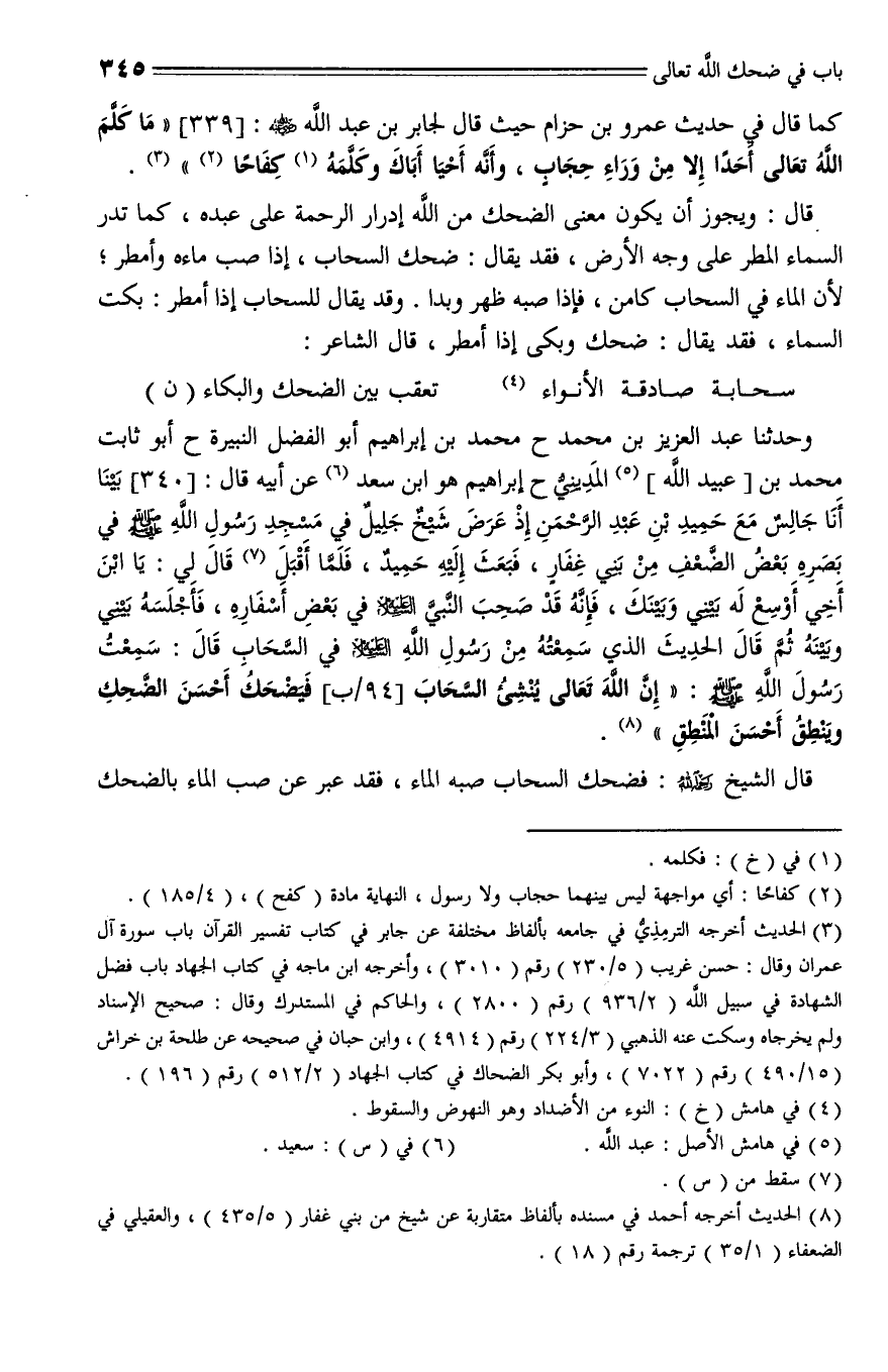 340 - وحَدَّثَنَا عَبْدُ الْعَزِيزِ بْنُ مُحَمَّدٍ، حَدَّثَنا مُحَمَّدُ بْنُ إِبْرَاهِيمَ أَبُو الْفَضْلِ النبيرة، حَدَّثَنا أَبُو ثَابِتٍ مُحَمَّدُ بْنُ عُبَيْدِ اللَّهِ الْمَدينِيُّ، حَدَّثَنا إِبْرَاهِيمُ - هُوَ ابْنُ سَعد - عَنْ أَبِيهِ، قال: بَيْنَا أَنَا جَالِسٌ مَعَ حُمَيْدِ بْنِ عَبْدِ الرَّحْمَنِ إِذْ عَرَضَ شَيْخٌ جَلِيلٌ فِي مَسْجِدِ رَسُولِ اللَّهِ - صلى الله عليه وسلم - , فِي بَصَرِهِ بَعْضُ الضَّعْفِ , مِنْ بَنِي غِفَارٍ , فَبَعَثَ إِلَيْهِ حُمَيْدٌ , فَلَمَّا أقبل قَالَ لِي: يَا ابْنَ أَخِي , أَوْسِع لَهُ بَيْنِي وَبَيْنَكَ , فَإِنَّهُ قَدْ صَحِبَ النَّبِيَّ عليه السلام (ق93أ) فِي بَعْضِ أَسْفَارِهِ فأجلسته بَيْنِي وَبَيْنَهُ , ثُمَّ قَالَ الْحَدِيثَ الَّذِي سَمِعْتُه مِنْ رَسُولِ اللَّهِ عليه السلام فِي السَّحَابِ، قال: سَمِعْتُ رَسُولَ اللَّهِ - صلى الله عليه وسلم - , يَقُولُ: " إِنَّ اللَّهَ تَعَالَى يُنْشِئُ السَّحَابَ , فَيَضْحَكُ أَحْسَنَ الضَّحِكِ , وَيَنْطِقُ أَحْسَنَ المنْطِقِ ".