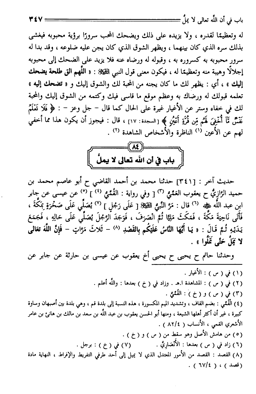 341 - حَدَّثَنَا مُحَمَّدُ بْنُ أَحْمَدَ الْقَاضِي، حَدَّثَنا أَبُو عَاصِمٍ، حَدَّثَنا مُحَمَّدُ بْنُ حُمَيْدٍ الرَّازِيُّ، حَدَّثَنا يَعْقُوبُ العمي - وفي رواية: القُمِّيُّ - عَنْ عِيسَى , عَنْ جَابِرِ بْنِ عَبْدِ اللَّهِ , رَضِيَ اللَّهُ عَنْهُ، قال: " مَرَّ النَّبِيُّ عليه السلام عَلَى رَجُلٍ يُصَلِّي عَلَى صَخْرَةٍ بِمَكَّةَ , فَأَتَى نَاحِيَةَ مَكَّةَ , فَمَكَثَ مَلِيًّا , ثُمَّ انْصَرَفَ , فَوَجَدَ الرَّجُلَ يُصَلِّي عَلَى حَالِهِ , فَجَمَعَ يَدَيْهِ , ثُمَّ قال: " يا أَيُّهَا النَّاسُ , عَلَيْكُمْ بِالْقَصْدِ - ثَلَاثَ مَرَّاتٍ - , (ق94أ) فَإِنَّ اللَّهَ تَعَالَى لَا يَمَلُّ حَتَّى تَمَلُّوا ".