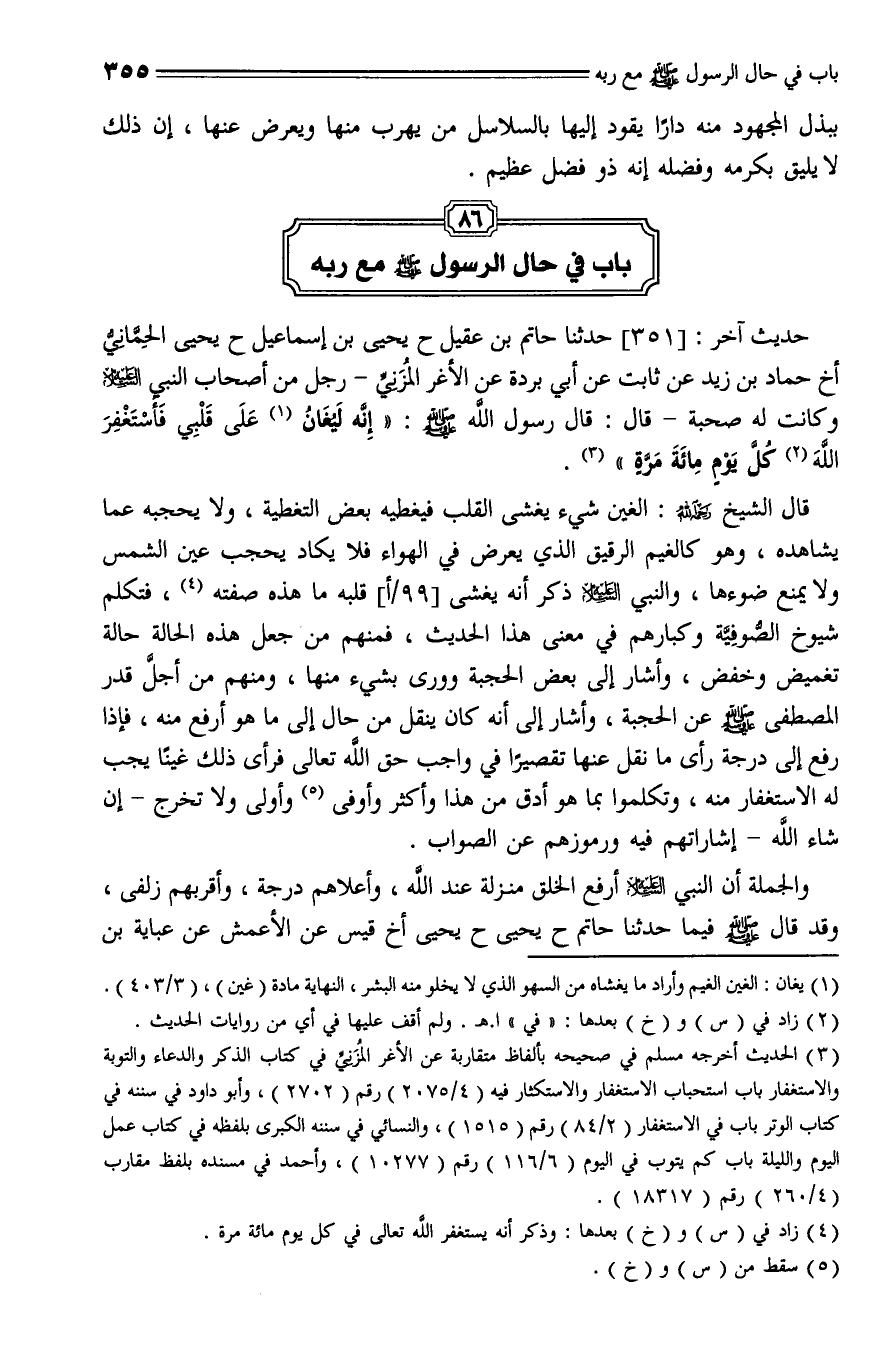 351 - حَدَّثَنَا حَاتِمُ بْنُ عَقِيلٍ , حَدَّثَنا يَحْيَى بْنُ إِسْمَاعِيلَ، حَدَّثَنا يَحْيَى الْحِمَّانِيُّ، أخبرنا حَمَّادُ بْنُ زَيْدٍ , عَنْ ثَابِتٍ , عَنْ أَبِي بُرْدَةَ , عَنِ الْأَغَرِّ الْمُزَنِيِّ - رَجُل مِنْ أَصْحَابِ النَّبِيِّ عليه السلام، وَكَانَتْ لَهُ صُحْبَةٌ - قَالَ: قال رَسُولُ اللَّهِ - صلى الله عليه وسلم -: " إِنَّهُ لَيُغَانُ عَلَى قَلْبِي , فَأَسْتَغْفِرُ اللَّهَ فِي كُلِّ يَوْمٍ وليلة مِائَةَ مَرَّةٍ ".