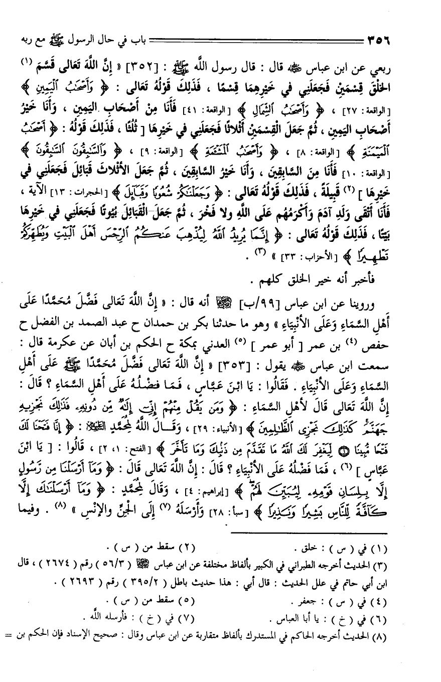 353 - حَدَّثَنَا بَكْرُ بْنُ حَمْدَانَ، حَدَّثَنا عَبْدُ الصَّمَدِ بْنُ الْفَضْلِ، حَدَّثَنا حفص بْنُ عُمَرَ أبو عمر الْعَدَنِيُّ (ق98أ) بِمَكَّةَ، حَدَّثَنا الْحَكَمُ بْنُ أَبَانَ , عَنْ عِكْرِمَةَ , قال: سَمِعْتُ ابْنَ عَبَّاسٍ , يَقُولُ: " إِنَّ اللَّهَ تَعَالَى فَضَّلَ مُحَمَّدًا - صلى الله عليه وسلم - عَلَى أَهْلِ السَّمَاءِ , وَعَلَى الْأَنْبِيَاءِ , فَقَالُوا: يَا ابْنَ عَبَّاسٍ , فَمَا فَضْلُهُ عَلَى أَهْلِ السَّمَاءِ، إِنَّ اللَّهَ تعالى قَالَ لِأَهْلِ السَّمَاءِ: {وَمَنْ يَقُلْ مِنْهُمْ إِنِّي إِلَهٌ مِنْ دُونِهِ فَذَلِكَ نَجْزِيهِ جَهَنَّمَ كَذَلِكَ نَجْزِي الظَّالِمِينَ} , وَقَالَ اللَّهُ ت لِمُحَمَّدٍ عليه السلام: {إِنَّا فَتَحْنَا لَكَ فَتْحًا مُبِينًا لِيَغْفِرَ لَكَ اللَّهُ مَا تَقَدَّمَ مِنْ ذَنْبِكَ وَمَا تَأَخَّرَ} , قَالُوا: يَا أبا العَبَّاسٍ , فَمَا فَضْلُهُ عَلَى الْأَنْبِيَاءِ؟ قال: إِنَّ اللَّهَ تَعَالَى، قال: {وَمَا أَرْسَلْنَا مِنْ رَسُولٍ إِلَّا بِلِسَانِ قَوْمِهِ لِيُبَيِّنَ لَهُمْ} , وَقَالَ لِمُحَمَّدٍ: {وَمَا أَرْسَلْنَاكَ إِلَّا كَافَّةً لِلنَّاسِ بَشِيرًا وَنَذِيرًا} , فَأَرْسَلَهُ اللَّهُ إِلَى الْجِنِّ , وَالْإِنْسِ ".