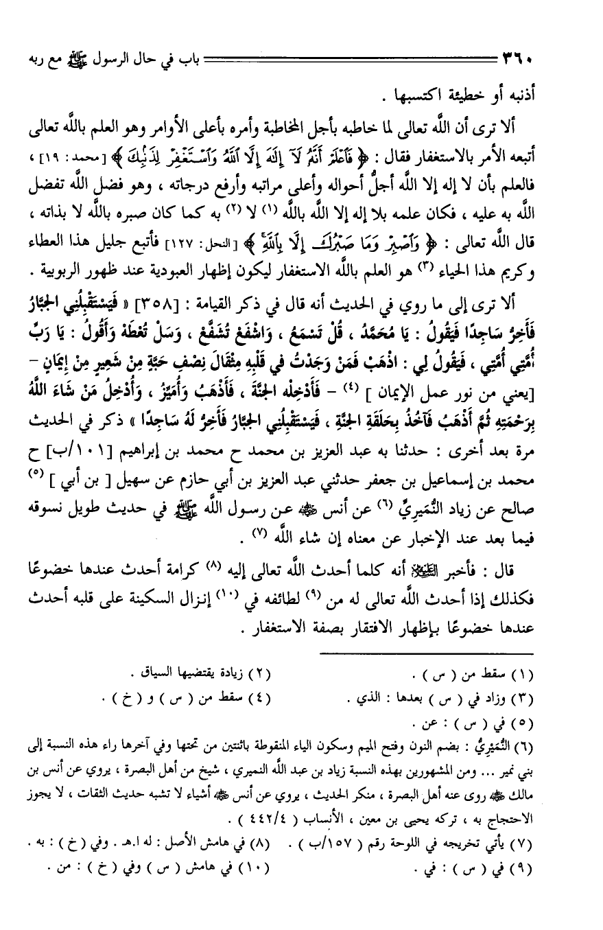 358 - أَلَا تَرَى إِلَى مَا رُوِيَ فِي الْحَدِيثِ , أَنَّهُ قَالَ فِي ذِكْرِ الْقِيَامَةِ: " فَيَسْتَقْبِلُنِي الْجَبَّارُ , فَأَخِّرُ سَاجِدًا , فَيَقُولُ: يَا مُحَمَّدُ، قُلْ تُسْمَعْ , وَاشْفَعْ تُشَفَّعْ , وَسَلْ تُعْطَهْ , فَأَقُولُ: يَا رَبِّ أُمَّتِي , أُمَّتِي , فَيَقُولُ: اذْهَبْ , فَمَنْ وَجَدْتَ فِي قَلْبِهِ مِثْقَالَ نِصْفِ حَبَّةٍ مِنْ شَعِيرٍ مِنْ إِيمَانٍ - يعني من نور عمل الإيمان - فَأَدْخِلْهُ الْجَنَّةَ , فَأَذْهَبُ , وَأُمِيِّزُ , وَأُدْخِلُ مَنْ شَاءَ اللَّهُ بِرَحْمَتِهِ , ثُمَّ أَذْهَبُ , فَآَخُذُ بِحَلْقَةِ الْجَنَّةِ , فَيَسْتَقْبِلُنِي الْجَبَّارُ , فَأَخِّرُ لَهُ سَاجِدًا ...... " , ذُكِرَ فِي الْحَدِيثِ مَرَّةً بَعْدَ أُخْرَى.
