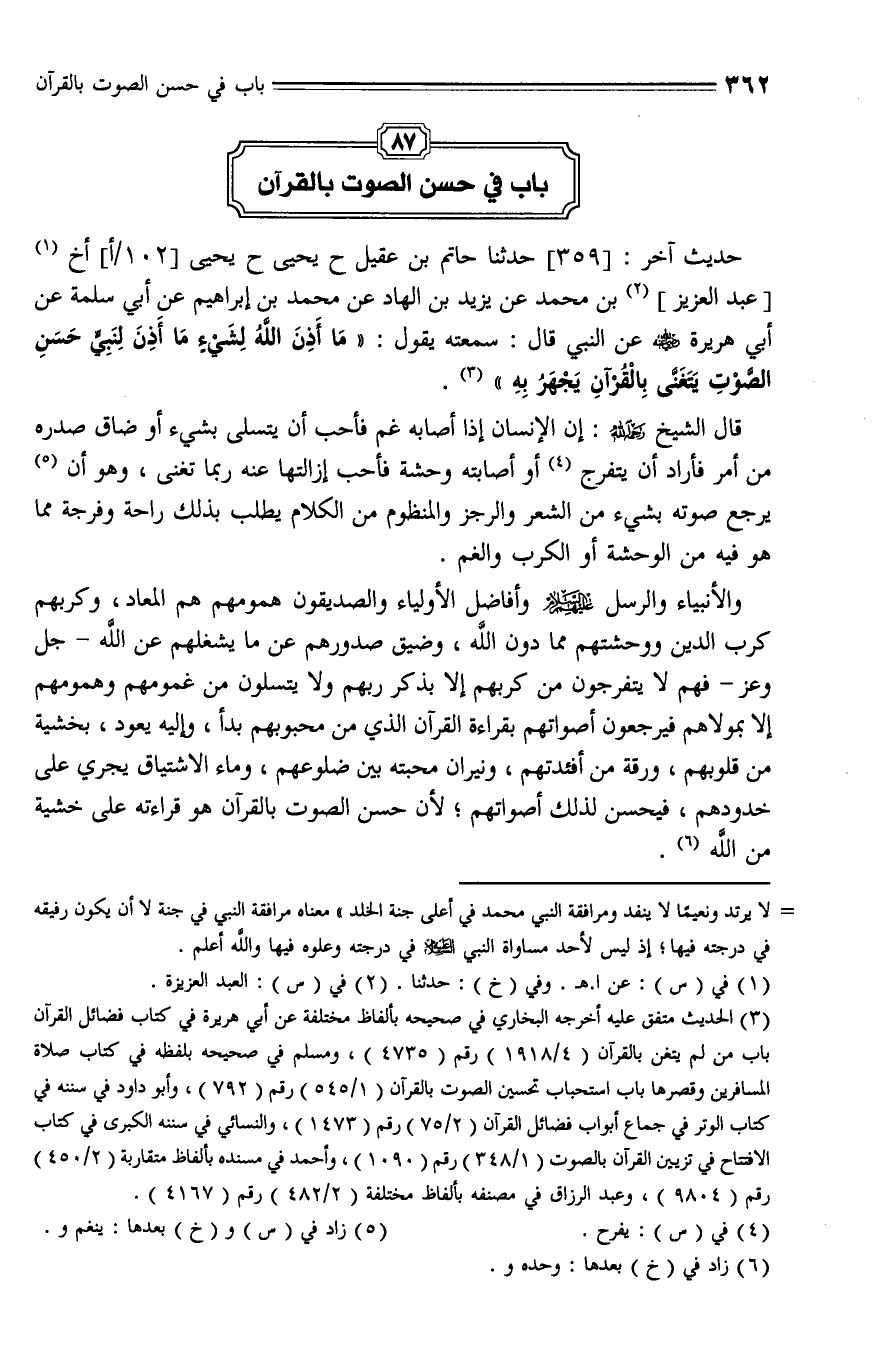 359 - حَدَّثَنَا حَاتِمٌ بن عقيل، حَدَّثَنَا يَحْيَى، حَدَّثَنَا يَحْيَى , أخبرنا عَبْدِ الْعَزِيز بْن مُحَمَّدٍ , عَنْ يَزِيدَ بْنِ الْهَادِ , عَنْ مُحَمَّدِ بْنِ إِبْرَاهِيمَ , عَنْ أَبِي سَلَمَةَ , عَنْ أَبِي هُرَيْرَةَ - رضي الله عنه - عَنِ النَّبِيِّ قال: سَمِعْتُهُ يَقُولُ: " مَا أَذِنَ اللَّهُ لشَيْءٍ مَا أَذِنَ لِنَبِيٍّ حَسَنِ الصَّوْتِ , يَتَغَنَّى بِالْقُرْآنِ يَجْهَرُ بِهِ ".