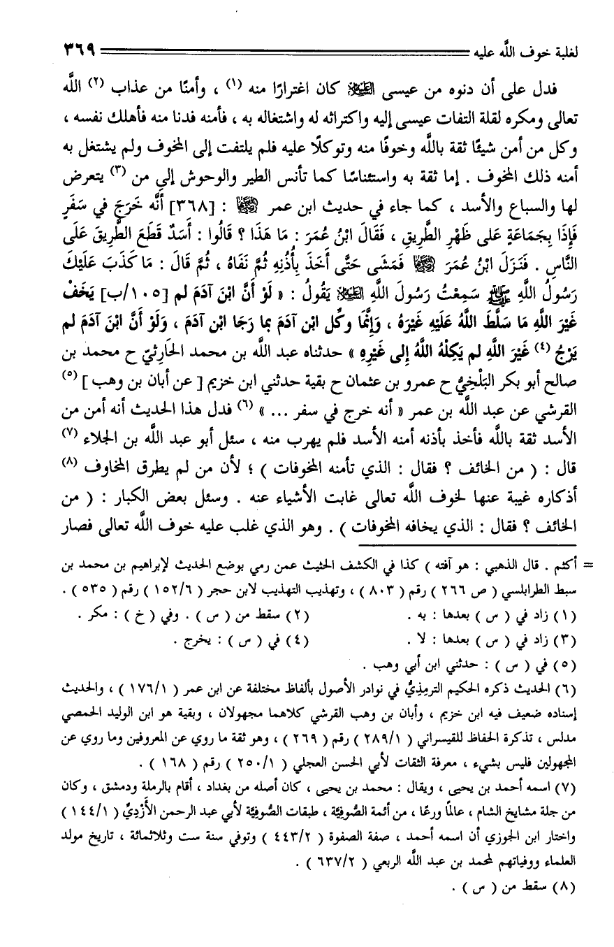 368 - كَمَا جَاءَ فِي حَدِيثِ ابْنِ عُمَرَ رَضِيَ اللَّهُ عَنْهُ , أَنَّهُ خَرَجَ فِي سَفَرٍ , فَإِذَا بجَمَاعَةُ عَلَى ظَهْرِ الطَّرِيقِ , فَقَالَ ابْنُ عُمَرَ: (ق104ب) مَا هَذَا؟ قَالُوا: أَسَدٌ قَطَعَ الطَّرِيقَ عَلَى النَّاسِ , فَنَزَلَ ابْنُ عُمَرَ - رضي الله عنه - فَمَشَى حَتَّى أَخَذَ بِأُذُنِهِ , ثُمَّ نَفَاهُ , ثُمَّ قال: مَا كَذَبَ عَلَيْكَ رَسُولُ اللَّهِ - صلى الله عليه وسلم - سَمِعْتُ رَسُولَ اللَّهِ عليه السلام يَقُولُ: " لَوْ أَنَّ ابْنَ آدَمَ لَمْ يَخَفْ غَيْرَ اللَّهِ مَا سَلَّطَ اللَّهُ عَلَيْهِ غَيْرَهُ , وَإِنَّمَا وُكِّلَ ابْنُ آدَمَ لَمَّا رَجَا ابْنَ آدَمَ , وَلَوْ أَنَّ ابْنَ آدَمَ لَمْ يَرْجُ غَيْرَ اللَّهِ لَمْ يَكِلْهُ اللَّهُ إِلَى غَيْرِهِ ".