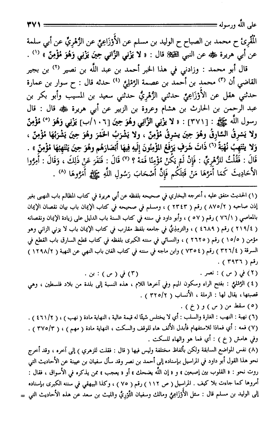 371 - قَالَ أَبُو مُحَمَّدٍ: وَزَادَنِي فِي هَذَا الْخبر، أَحْمَدُ بْنُ عَبْدِ اللَّهِ بْنِ نَصْرِ بْنِ بَحِيرٍ الْقَاضِي، أن مُحَمَّدِ بْنِ أَحْمَدَ بْنِ عِصْمَةَ الرَّمْلِيُّ حَدَّثَهُ، قال: حَدَّثَنَا سَوَّارُ بْنُ عُمَارَةَ , حَدَّثَنِي هِقْلٌ , عَنِ الْأَوْزَاعِيِّ , حَدَّثَنِي الزُّهْرِيُّ , حَدَّثَنِي سَعِيدُ بْنُ الْمُسَيِّبِ , وَأَبُو بَكْرِ بْنُ عَبْدِ الرَّحْمَنِ بْنِ الْحَارِثِ بْنِ هِشَامٍ , وَعُرْوَةُ بْنُ الزُّبَيْرِ , عَنْ أَبِي هُرَيْرَةَ - رضي الله عنه - قَالَ: قال رَسُولُ اللَّهِ - صلى الله عليه وسلم -:" لَا يَزْنِي الزَّانِي وَهُوَ حِينَ يَزْنِي مُؤْمِنٌ , وَلَا يَسْرِقُ السَّارِقُ وَهُوَ حِينَ يَسْرِقُ مُؤْمِنٌ , وَلَا يَشْرَبُ الْخَمْرُ وَهُوَ حِينَ يَشْرَبُهَا مُؤْمِنٌ , وَلَا يَنْتهبُ نُهْبَةً ذَاتَ شَرَفٍ يَرْفَعُ الْمُؤْمِنُونَ إِلَيْهِ (ق105ب) فِيهَا أَبْصَارَهُمْ وَهُوَ حِينَ يَنْتَهِبُهَا مُؤْمِنٌ "، قال: فَقُلْتُ لِلزُّهْرِيِّ: فَإِنْ لَمْ يَكُنْ مُؤْمِنًا فَمَهْ؟، فَنَفَرَ عَنْ ذَلِكَ وَقال: أَمِرُّوا الْأَحَادِيثَ كَمَا أَمَرَّهَا مَنْ قَبْلَكُمْ , فَإِنَّ أَصْحَابَ رَسُولِ اللَّهِ أَمَرُّوهَا.