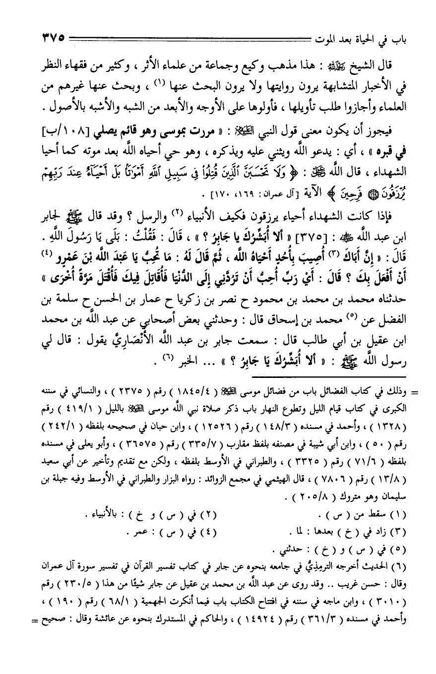 375 - وَقَدْ قَالَ - صلى الله عليه وسلم - لِجَابِرِ بْنِ عَبْدِ اللَّهِ - رضي الله عنه -: " أَلَا أُبَشِّرُكَ يَا جَابِرُ؟ قَالَ: فَقُلْتُ: بَلَى يَا رَسُولَ اللَّهِ، قَالَ: إِنْ أَبَاكَ أُصِيبَ بِأُحُدٍ أَحْيَاهُ اللَّهُ , ثُمَّ قَالَ لَهُ: مَا تُحِبُّ يَا عَبْدَ اللَّهِ بْنَ عَمْرٍو أَنْ أَفْعَلَ بِكَ؟ فَقَالَ: أَيْ رَبِّ أُحِبُّ أَنْ تَرُدَّنِي إِلَى الدُّنْيَا , فَأُقَاتِلَ فِيكَ , فَأُقْتَلَ مَرَّةً أُخْرَى ".
