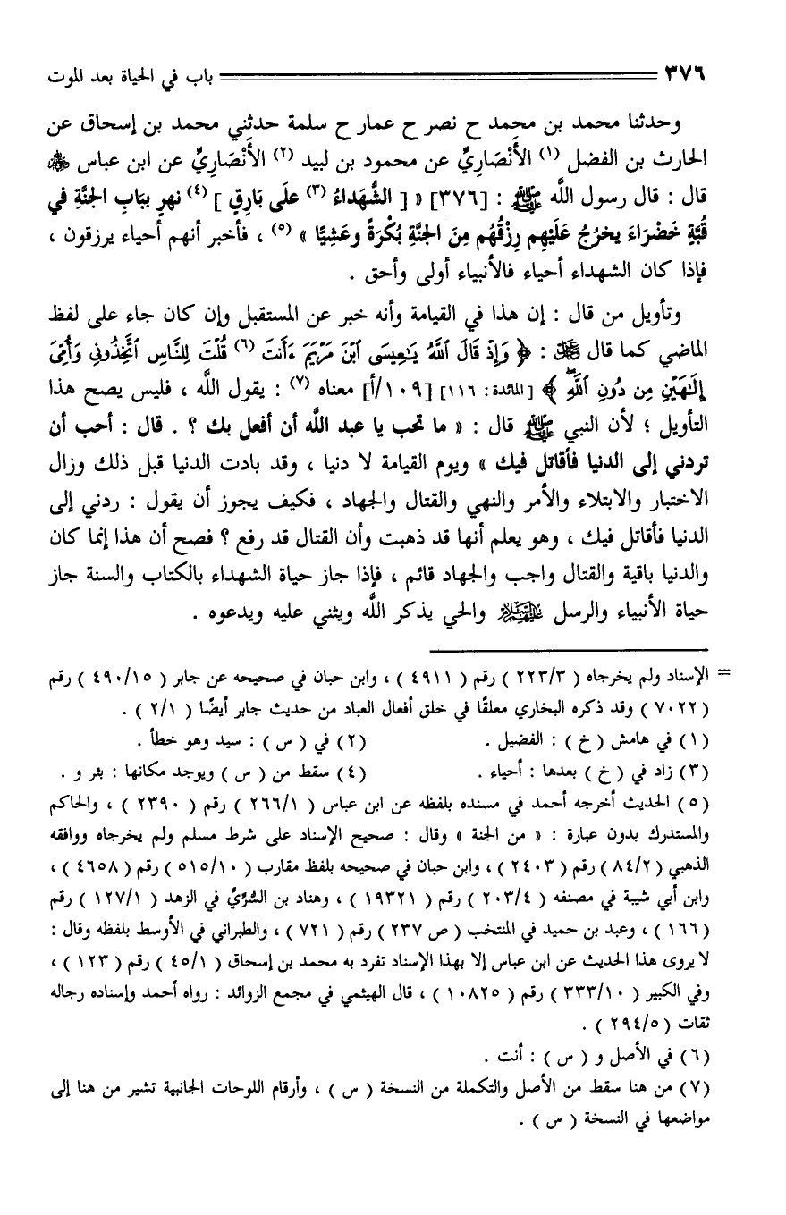 376 - وَحَدَّثَنَا مُحَمَّدُ بْنُ مُحَمَّدِ، حَدَّثَنَا نَصْرٌ، حَدَّثَنَا عَمَّارٌ، حَدَّثَنَا سَلَمَةُ , حَدَّثَنِي مُحَمَّدُ بْنُ إِسْحَاقَ , عَنِ الْحَارِثِ بْنِ الْفُضَيْلِ الْأَنْصَارِيِّ , عَنْ مَحْمُودِ بْنِ لبيدِ الْأَنْصَارِي , عَنِ ابْنِ عَبَّاسٍ، قَالَ: قال رَسُولُ اللَّهِ - صلى الله عليه وسلم -: " الشُّهَدَاءُ عَلَى بَارِقِ نَهَرٍ بِبَابِ الْجَنَّةِ , فِي قُبَّةٍ خَضْرَاءَ يَخْرُجُ عَلَيْهِمْ رِزْقُهُمْ مِنَ الْجَنَّةِ بُكْرَةً وَعَشِيًّا ".