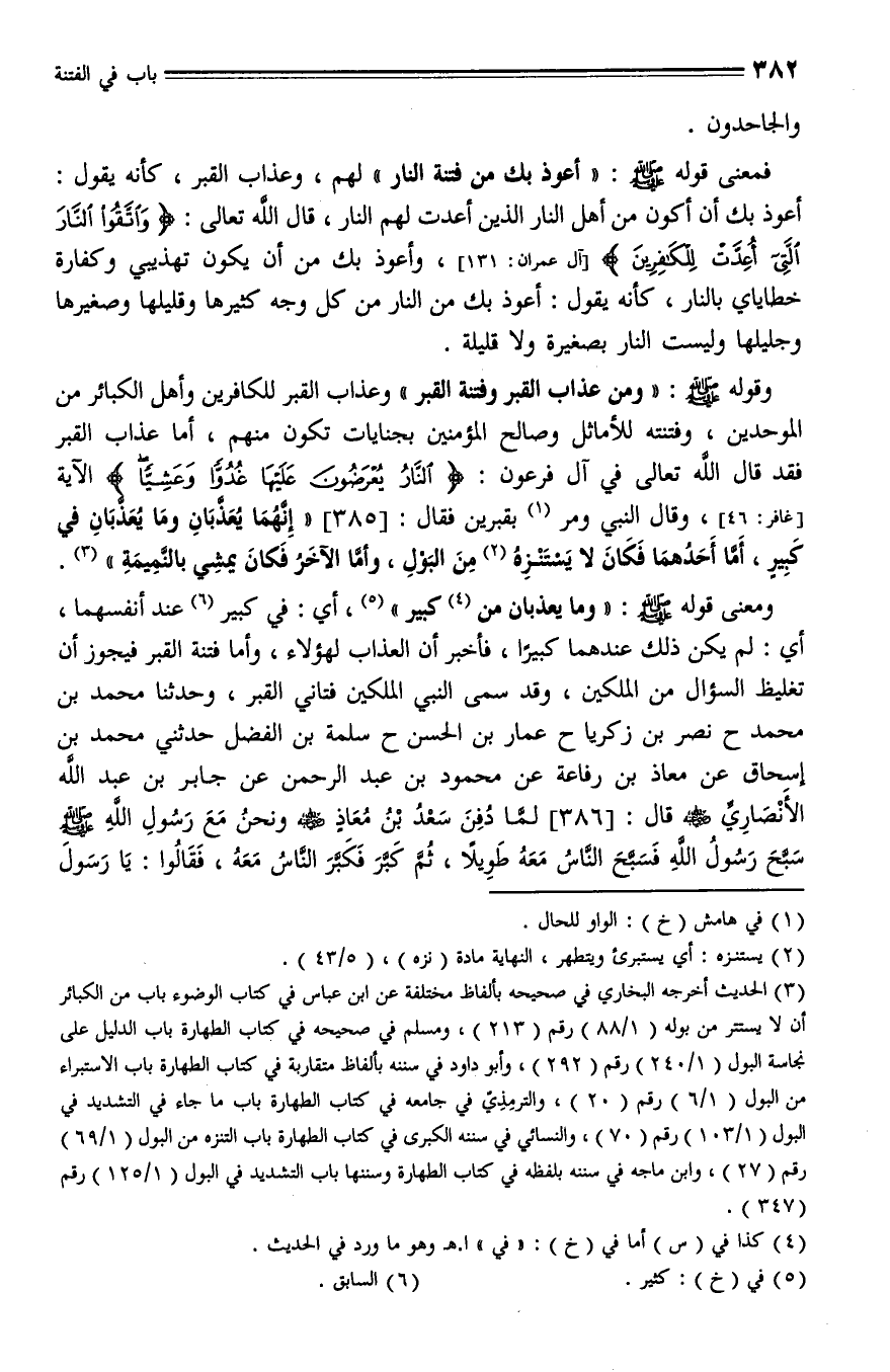 386 - وَحَدَّثَنَا مُحَمَّدُ بْنُ مُحَمَّدٍ، حَدَّثَنَا نَصْرُ بْنُ زَكَرِيَّا، حَدَّثَنَا عُمَارَةُ بْنُ الْحَسَنِ، حَدَّثَنَا سَلَمَةُ بْنُ الْفَضْلِ , حَدَّثَنِي مُحَمَّدُ بْنُ إِسْحَاقَ , عَنْ مُعَاذِ بْنِ رِفَاعَةَ , عَنْ مَحْمُودِ بْنِ عَبْدِ الرَّحْمَنِ , عَنْ جَابِرِ بْنِ عَبْدِ اللَّهِ الْأَنْصَارِيِّ , رَضِيَ اللَّهُ عَنْهُ، قال: " لَمَّا دُفِنَ سَعْدُ بْنُ مُعَاذٍ - رضي الله عنه - , وَنَحْنُ مَعَ رَسُولِ اللَّهِ - صلى الله عليه وسلم - سَبَّحَ رَسُولُ اللَّهِ , فَسَبَّحَ النَّاسُ مَعَهُ طَوِيلًا , ثُمَّ كَبَّرَ , فَكَبَّرَ النَّاسُ مَعَهُ , فَقَالُوا: يَا رَسُولَ اللَّهِ مِمَّ سَبَّحْتَ؟ فقال: لَقَدْ تَضَايَقَ عَلَى هَذَا الرَّجُلِ الصَّالِحِ قَبْرُهُ حَتَّى فَرَّجَهُ اللَّهُ عَنْهُ ".