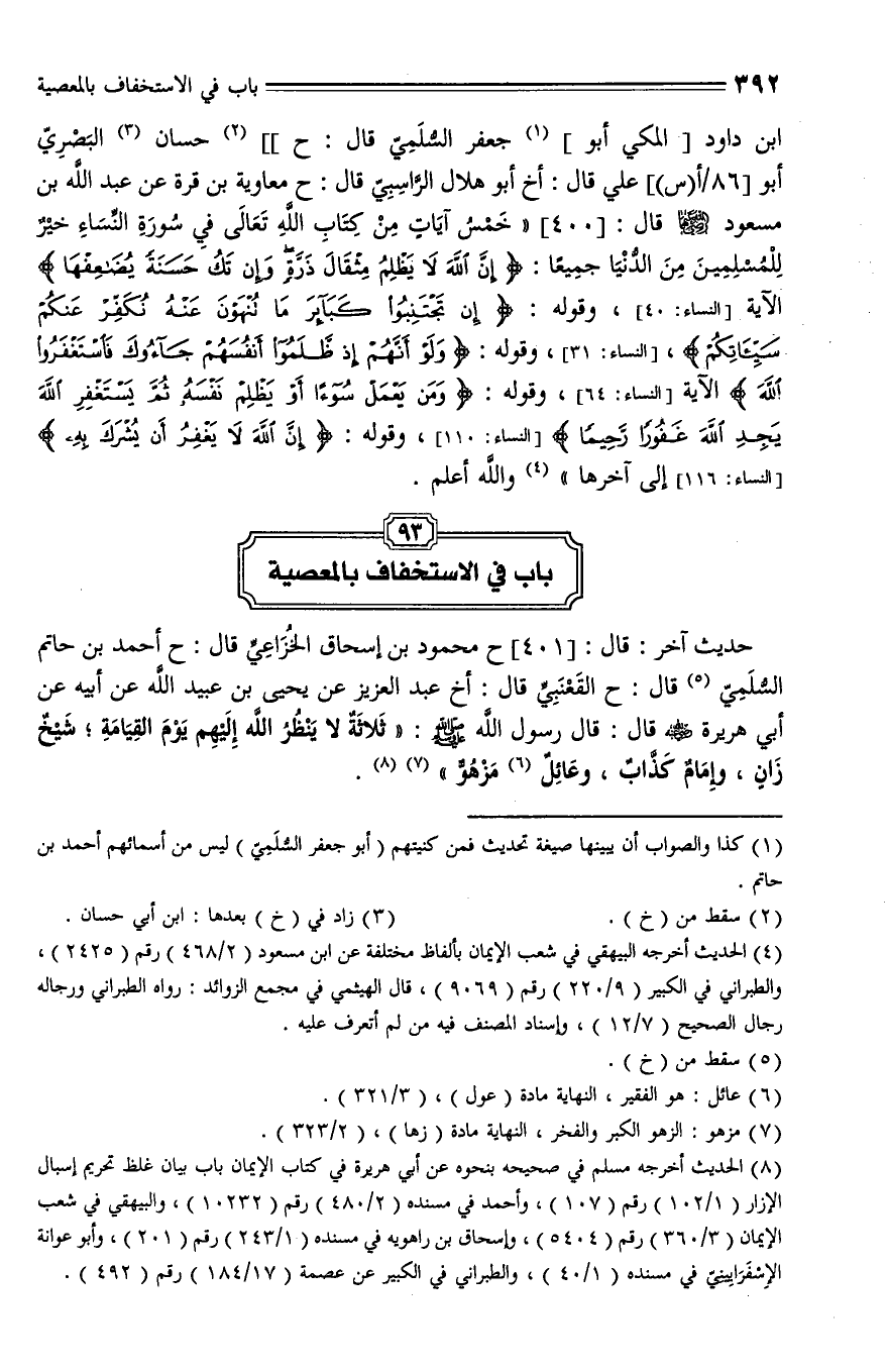 401 - حَدَّثَنا مَحْمُودُ بْنُ إِسْحَاقَ الْخُزَاعِيُّ، قال: حَدَّثَنا أَحْمَدُ بْنُ حَاتِمٍ بن داود السُّلَمِيُّ، قال: حَدَّثَنا الْقَعْنَبِيُّ، قال: أخبرنا عَبْدُ الْعَزِيزِ , عَنْ يَحْيَى بْنِ عُبَيْدِ اللَّهِ , عَنْ أَبِيهِ , عَنْ أَبِي هُرَيْرَةَ رَضِيَ اللَّهُ عَنْهُ، قَالَ: قال رَسُولُ اللَّهِ صلى الله عليه وسلم: " ثَلَاثَةٌ لَا يَنْظُرُ اللَّهُ إِلَيْهِمْ يَوْمَ الْقِيَامَةِ: شَيْخٌ زَانٍ , وَإِمَامٌ كَذَّابٌ , وَعَائِلٌ مَزْهُوٌّ".