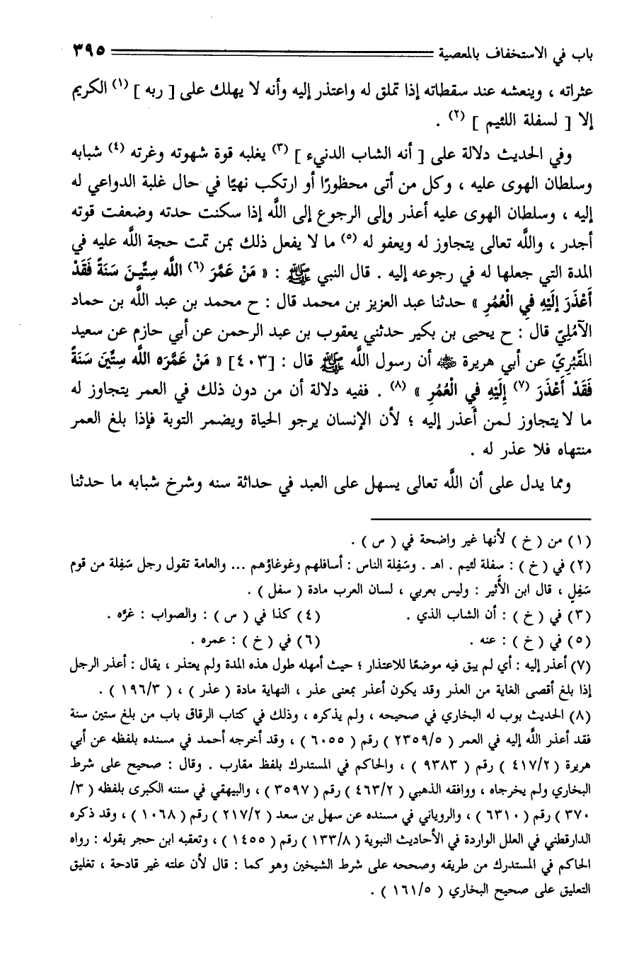 403 - حَدَّثَنَا عَبْدُ الْعَزِيزِ بْنُ مُحَمَّدٍ، حَدَّثَنا عَبْد اللَّهِ بْنِ حَمَّادٍ الْآَمُلِيُّ، حَدَّثَنا يَحْيَى بْنُ بُكَيْرٍ, حَدَّثَنِي يَعْقُوبُ بْنُ عَبْدِ الرَّحْمَنِ , عَنْ أَبِي حَازِمٍ , عَنْ سَعِيدٍ الْمَقْبُرِيِّ , عَنْ أَبِي هُرَيْرَةَ - رَضِيَ اللَّهُ عَنْهُ - أَنَّ رَسُولَ اللَّهِ - صلى الله عليه وسلم - قال: "مَنْ عَمَّرَهُ اللَّهُ سِتِّينَ سَنَةً , فَقَدْ أَعْذَرَ إِلَيْهِ فِي الْعُمُرِ ".