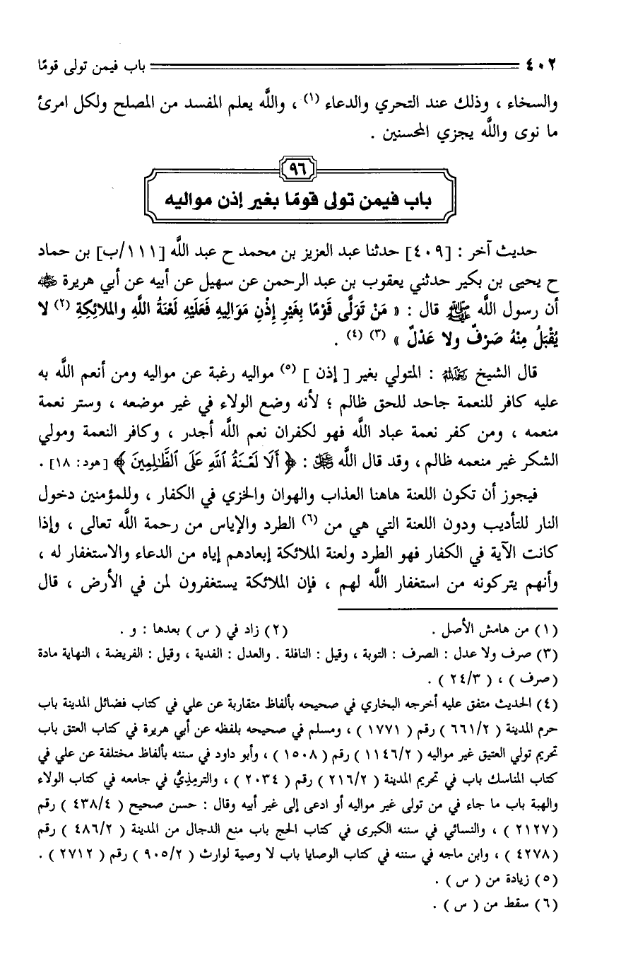 409 - حَدَّثَنا عَبْدُ العزيز بْنُ مُحَمَّدٍ، حَدَّثَنا عَبْدُ اللَّهِ بْنُ حَمَّادٍ، حَدَّثَنا يَحْيَى بْنُ بُكَيْرٍ، حَدَّثَنِي يَعْقُوبُ بْنُ عَبْدِ الرَّحْمَنِ , عَنْ سُهَيْلٍ , عَنْ أَبِيهِ , عَنْ أَبِي هُرَيْرَةَ , أَنَّ رَسُولَ اللَّهِ صلى الله عليه وسلم، قال: " مَنْ تَوَلَّى قَوْمًا بِغَيْرِ إِذْنِ مَوَالِيهِ , فَعَلَيْهِ لَعْنَةُ اللَّهِ وَالْمَلَائِكَةِ , لَا يُقْبَلُ مِنْهُ صَرْفٌ , وَلَا عَدْلٌ ".