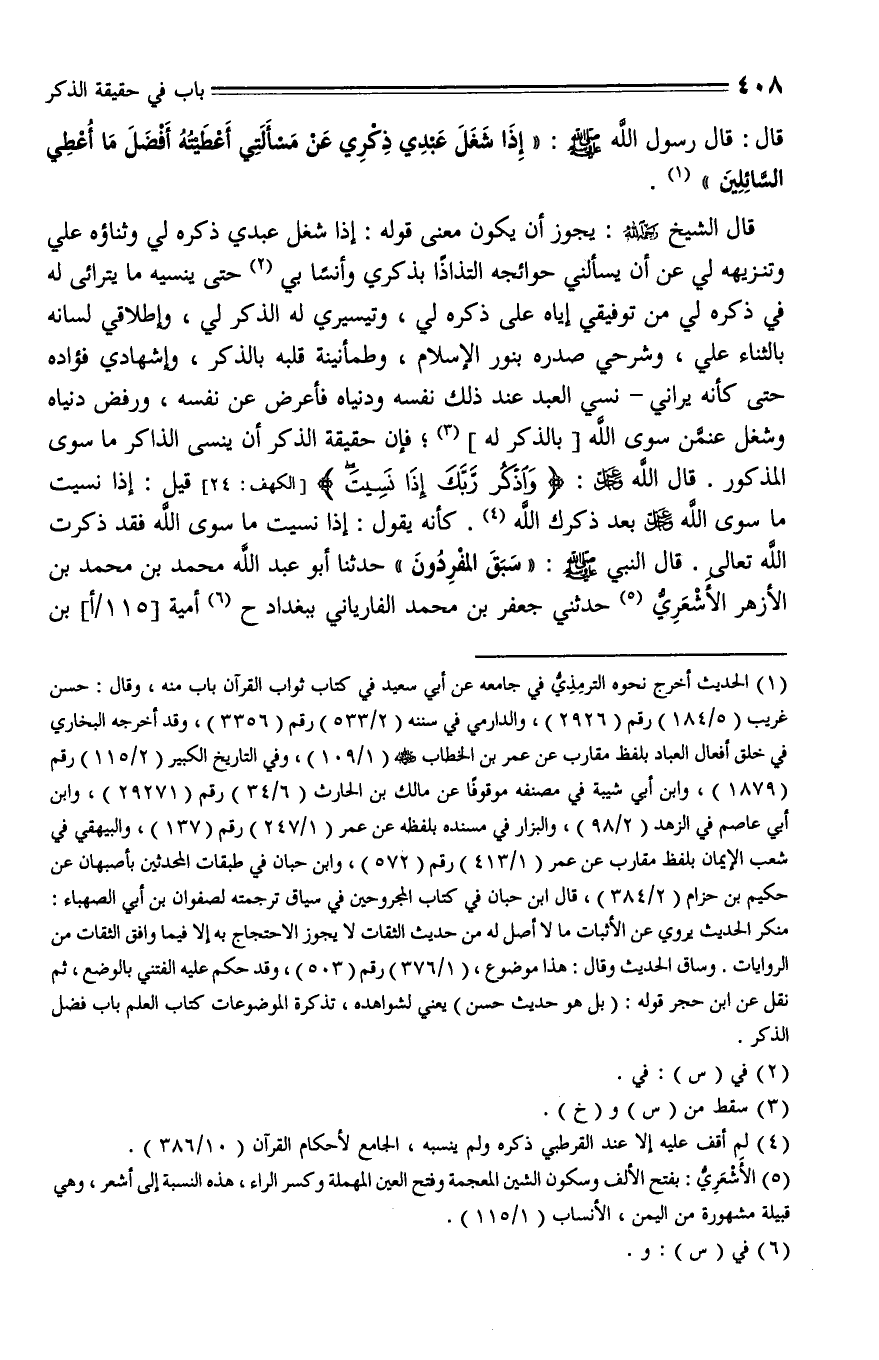 417 - حَدَّثَنَا أَبُو عَبْدِ اللَّهِ مُحَمَّدُ بْنُ مُحَمَّدِ بْنِ الْأَزْهَرِ الْأَشْعَرِيُّ، حَدَّثَنَا جَعْفَرُ بْنُ مُحَمَّدٍ الْفارْيَابِيُّ , بِبَغْدَادَ، حَدَّثَنَا أُمَيَّةُ بْنُ بِسْطَامٍ، حَدَّثَنَا يَزِيدُ بْنُ زُرَيْعٍ، حَدَّثَنَا رَوْحُ بْنُ الْقَاسِمِ , عَنِ الْعَلَاءِ بْنِ عَبْدِ الرَّحْمَنِ , عَنْ أَبِيهِ , عَنْ أَبِي هُرَيْرَةَ , قال: " كُنَّا مَعَ النبي عليه السلام فِي طَرِيقِ مَكَّةَ , فَمَرَّ عَلَى جَبَلٍ يُقَالُ لَهُ: جُمْدَانُ، قال: سِيرُوا، سَبَقَ الْمُفَرِّدُونَ , قَالُوا: يَا رَسُولَ اللَّهِ , ومَا الْمُفَرِّدُونَ؟ قال: الذَّاكِرُونَ اللَّهَ كَثِيرًا وَالذَّاكِرَاتُ ".