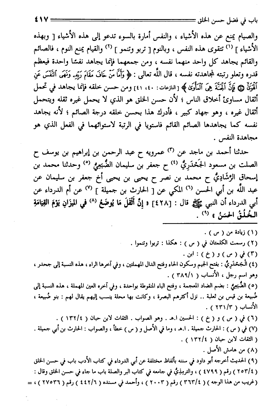428 - حَدَّثَنَا أَحْمَدُ بْنُ مَاجِدِ بْنِ عَمْرَوَيْهِ، حَدَّثَنَا عَبْدُ الرَّحْمَنِ بْنُ إِبْرَاهِيمَ بْنِ يُوسُفَ، حَدَّثَنَا الصَّلْتُ بْنُ مَسْعُودٍ الْجَحْدَرِيُّ، حَدَّثَنَا جَعْفَرُ بْنُ سُلَيْمَانَ الضُّبَعِيُّ - وَحَدَّثَنا مُحَمَّدُ بْنُ إِسْحَاقَ الرَّشَادِيُّ، حَدَّثَنَا مُحَمَّدُ بْنُ نَصْرٍ، حَدَّثَنَا يَحْيَى بْنُ يَحْيَى , أخبرنا جَعْفَرُ بْنُ سُلَيْمَانَ - عَنْ عَبْدِ اللَّهِ بْنِ أَبِي الْحُسَيْنِ الْمَكِّيِّ , عَنِ الْحَارِثِ بْنِ [أبي] (1) جَمِيلَةَ , عَنْ أُمِّ الدَّرْدَاءِ , عَنْ أَبِي الدَّرْدَاءِ , أَنَّ النَّبِيَّ - صلى الله عليه وسلم - قال: " إِنَّ أَثْقَلَ مَا يُوضَعُ فِي الْمِيزَانِ يَوْمَ الْقِيَامَةِ الْخُلُقُ الْحَسَنُ ".